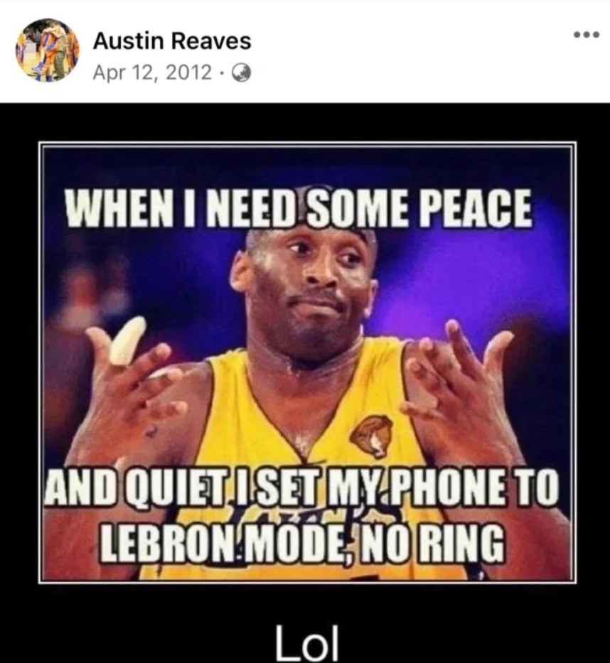 En avril 2012n avant le premier titre de LeBron avec Miami : ce partage d'un meme de Kobe avec le message "Quand j'ai besoin de paix et de calme, je mets mon téléphone en mode LeBron : No Ring", avec la mention "LOL".