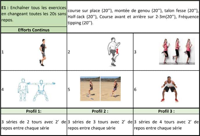 Ce programme se compose de deux types d’entraînements dont l’intensité et les répétitions dépendront de votre profil : un travail sur des efforts continus et un autre sur un intermittent avec 3 profils différents. Le travail continu est un travail d'endurance avec une durée d’exercice supérieure à 5’. Ce type d'exercice utilise principalement les filières énergétiques dites aérobies. Le travail intermittent suggère d'enchaîner des intervalles d'efforts plus courts et intenses mais répétés avec un moment de récupération plus ou moins long. On y travaillera les mêmes filières qu’en travail continu même si bien souvent la filière anaérobie lactique est privilégiée. Votre temps de travail et le nombre de séries dépendront de votre profil