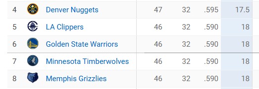 - Les Warriors ont raté le coche à domicile face à Houston, qui verrouille un peu plus la 2e place, grâce à un gros match défensif pour notamment pourrir la vie de Stephen Curry (3 pts à 1/10). C'est du coup serré comme jamais pour les places entre 4 et 8 dans la Conférence Ouest. Jugez plutôt...