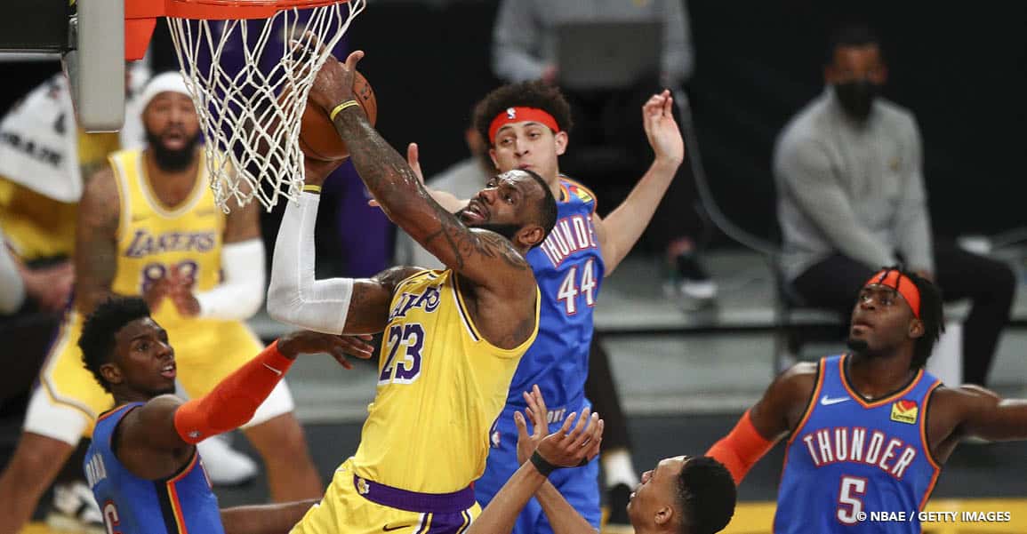 - Les Lakers se seraient bien épargnés une prolongation à OKC cette nuit. Sur le coup, c'était quand même plutôt un soulagement. L.A. était mené de 11 points dans le 4e quart-temps quand LeBron James s'est fâché et a activé le mode MVP pour un run qui aurait pu s'achever sur un succès poussif, mais en quatre quart-temps. C'était sans compter le sang froid de Shai Gilgeous-Alexander, dont les trois lancers réussis à 1 seconde de la fin ont fait prolonger le plaisir. - Derrière, comme toujours ou presque quand les Lakers doivent jouer une prolongation, le suspense a été très limité. Harrell, Schröder et Matthews ont d'emblée placé un 7-0 et le Thunder n'a jamais eu son mot à dire. - LeBron a signé son 3e triple-double de la saison, avec 28 points, 14 rebonds et 12 passes pour permettre aux Lakers, privés d'Anthony Davis, d'enregistrer un 5e succès de rang.LBJ to Wes Matthews.. got it!