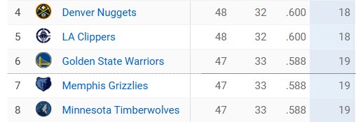- En plus de sa victoire à Memphis pour recoller aux Grizzlies, toujours 7e, Minnesota s'est offert le quart-temps avec le plus de points pour une équipe cette saison en NBA. Dans le 3e quart-temps, Anthony Edwards (44 pts) et les siens ont passé 52 points à leurs hôtes. Rudy Gobert a fini avec 13 points, 8 rebonds et 4 passes à 5/5. Tout reste à faire à l'Ouest pour les places allant de 4 à 8 (voir ci-dessous).