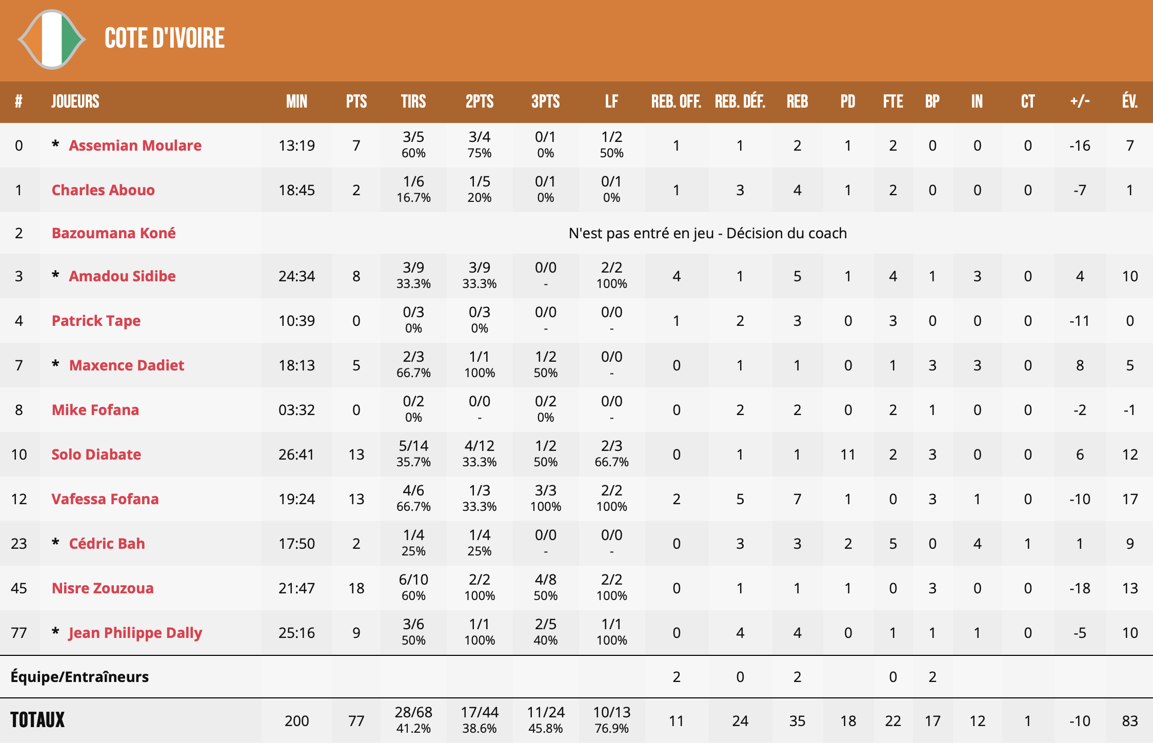 Le faible investissement des joueurs de Vincent Collet s’est immédiatement fait sentir. Les quatre premières minutes ont été les plus poussives, avec seulement cinq points marqués, permettant ainsi aux Éléphants de prendre une légère avance (5-10). Dans un élan éphémère, les Français ont toutefois accéléré pour inscrire 20 points lors des six minutes suivantes (25-21).