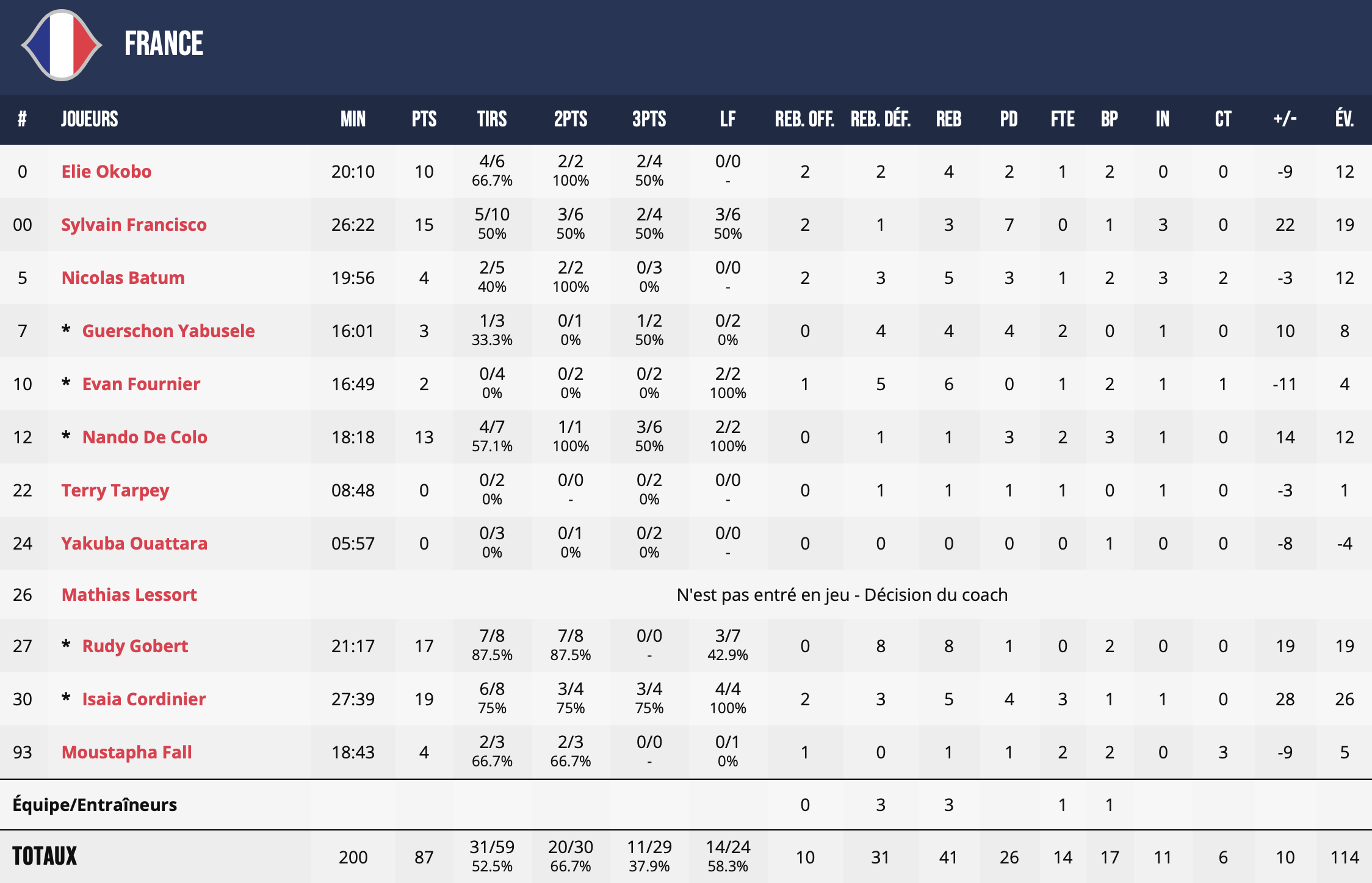 L’énergie et la concentration fluctuante, les favoris déchus ont alterné entre des phases de creux et de mieux. Les efforts d’Isaïa Cordinier, auteur de 9 points à 3/5 aux tirs en première mi-temps, ont été la seule constante lors de la première moitié du match. Son rebond offensif, suivi d’un beau trois points dans le corner pour passer en tête à 10 secondes de la pause (40-39), a offert une courte respiration aux siens. Mais leur souffle a aussitôt été coupé par Solo Diabate, revenant sur le terrain pour le traverser à la vitesse de l’éclair et marquer au-dessus de Rudy Gobert, afin de retrouver les vestiaires dans de bonnes dispositions (40-41).