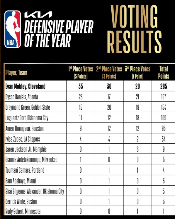 Quatre joueurs avant Evan Mobley étaient devenus DPoY à 23 ans : Alvin Robertson, Dwight Howard, Kawhi Leonard et Jaren Jackson Jr. Mobley avait déjà été le deuxième plus jeune joueur de l'histoire à devenir membre du meilleur cinq de la saison en 2023, à 21 ans.