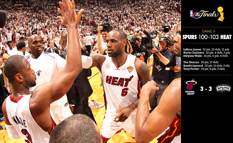 "C'est de loin un des meilleurs matches auxquels j'ai participé", déclarait LeBron James. "Les hauts et les bas, le retour, les émotions, les bonnes et les mauvaises tout au long du match. Participer à quelque chose comme ça, ce sont vraiment des émotions qu'il sera impossible à reproduire une fois que vous aurez quitté le jeu."[caption id="attachment_117126" align="alignright" width="300"] Sans son bandeau, LeBron James retrouve son mojo dans le money time du Game 6 des Finales NBA.[/caption] Longtemps, les Spurs ont cru pouvoir fêter leur 5e titre de champion en Floride. Comment aurait-il pu en être autrement alors que Tim Duncan a livré, l'espace d'une mi-temps, l'une des prestations les plus dantesques de sa carrière avec 30 pts et 17 rbds ? Alors que Kawhi Leonard, au-delà de toute considération statistique, a encore été époustouflant, et, surtout, que LeBron James a tremblé et craqué malgré des chiffres démentiels au final (32 pts, 11 pds, 10 rbds) par la faute, entre autres, de Boris Diaw... Le King, ressuscité dans le 4e quart-temps (après la perte de son bandeau diront les superstitieux) comme son équipe, n'a pas lâché malgré une spirale terrible. Et que dire de Chris Bosh, critiqué avant le match, pendant (et sans doute après par ses haters les plus acharnés) ? Décevant offensivement, l'intérieur du Heat a pourtant été décisif. C'est lui qui, en captant un rebond compliqué, a permis à Ray Allen de dégaîner dans le coin à 5 secondes du buzzer pour disputer l'overtime. C'est lui, également, qui a sorti deux contres cruciaux durant la prolongation sur Tony Parker, que l'on a cru clutch après un match très poussif, et Danny Green. Et que dire de Ray Allen et de ce shoot...