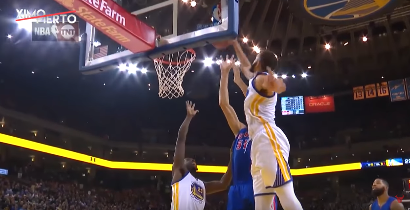 Le pivot des Warriors a bazardé au loin la tentative de layup de son homologue serbe des Pistons.