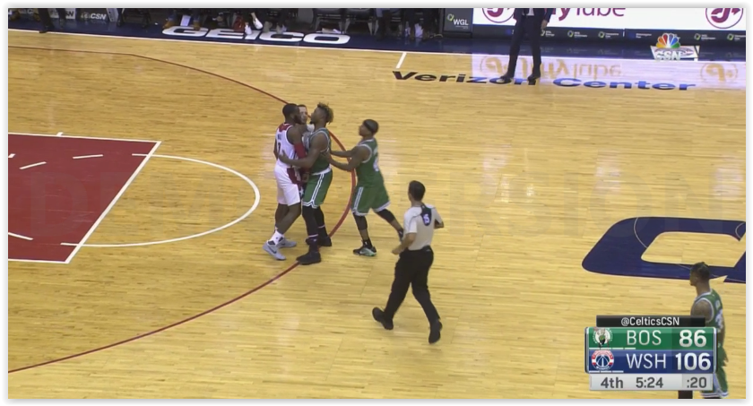 Déjà expulsé lors du match précédent, John Wall a été envoyé prématurément au vestiaire après cette grosse faute sur Marcus Smart hier soir.