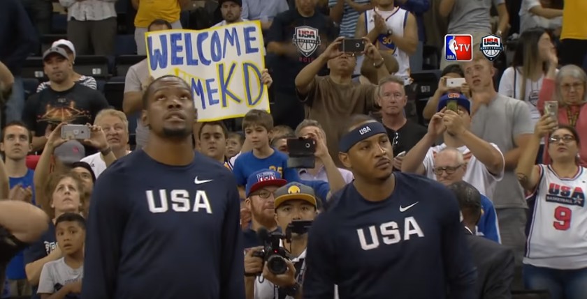 "Ils savent que j'ai pris une décision très difficile", poursuit Durant au sujet de ses coéquipiers. "Ils ont essayé de me m'être à l'aise et j'apprécie leur geste. Ce sont déjà de supers coéquipiers et je m'attends à vivre une grande saison."Green, Durant et Klay Thompson ont été titularisés d'entrée par Mike Krzyzewski. Ils ont contribué au nouveau large succès de Team USA.