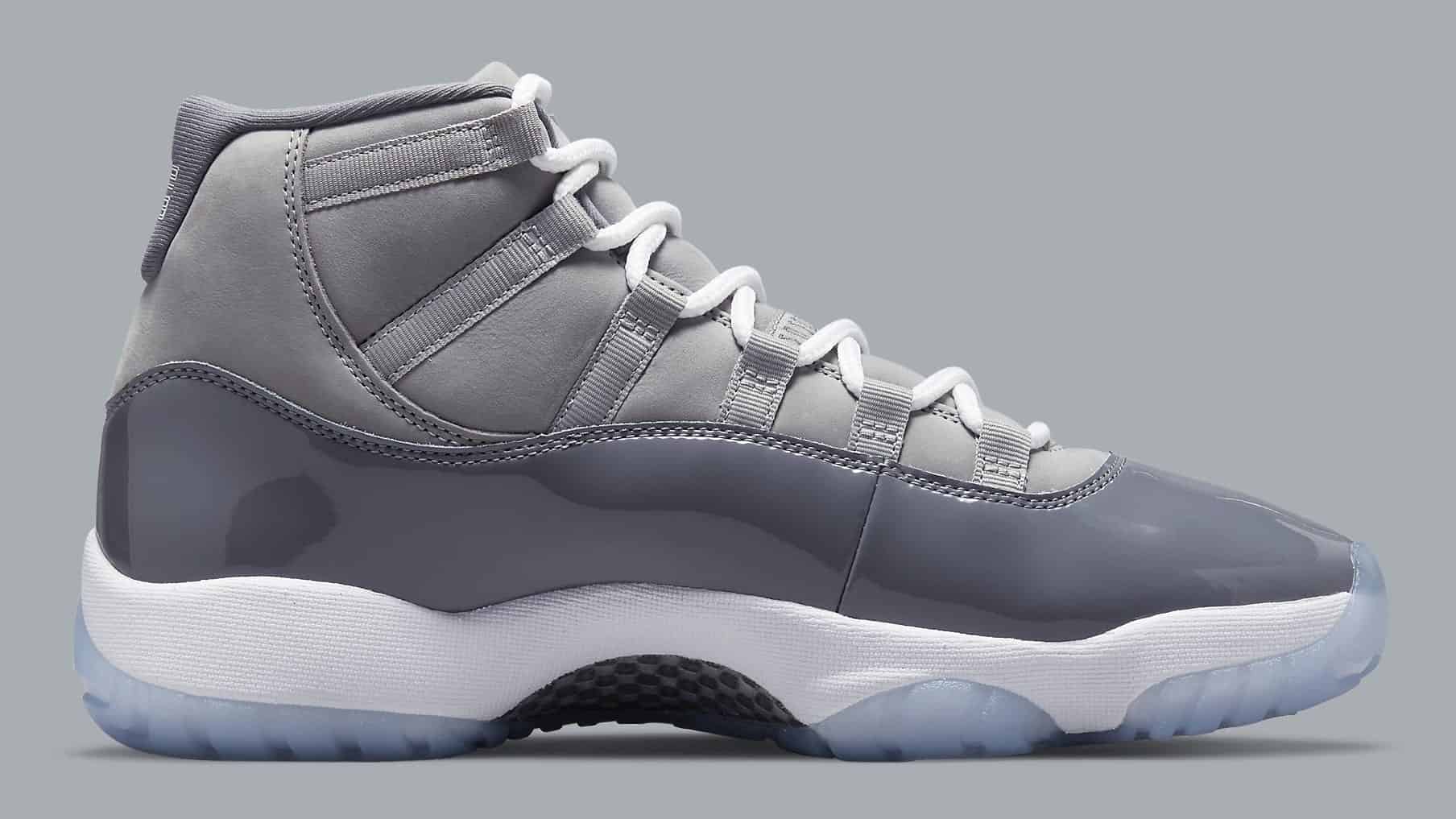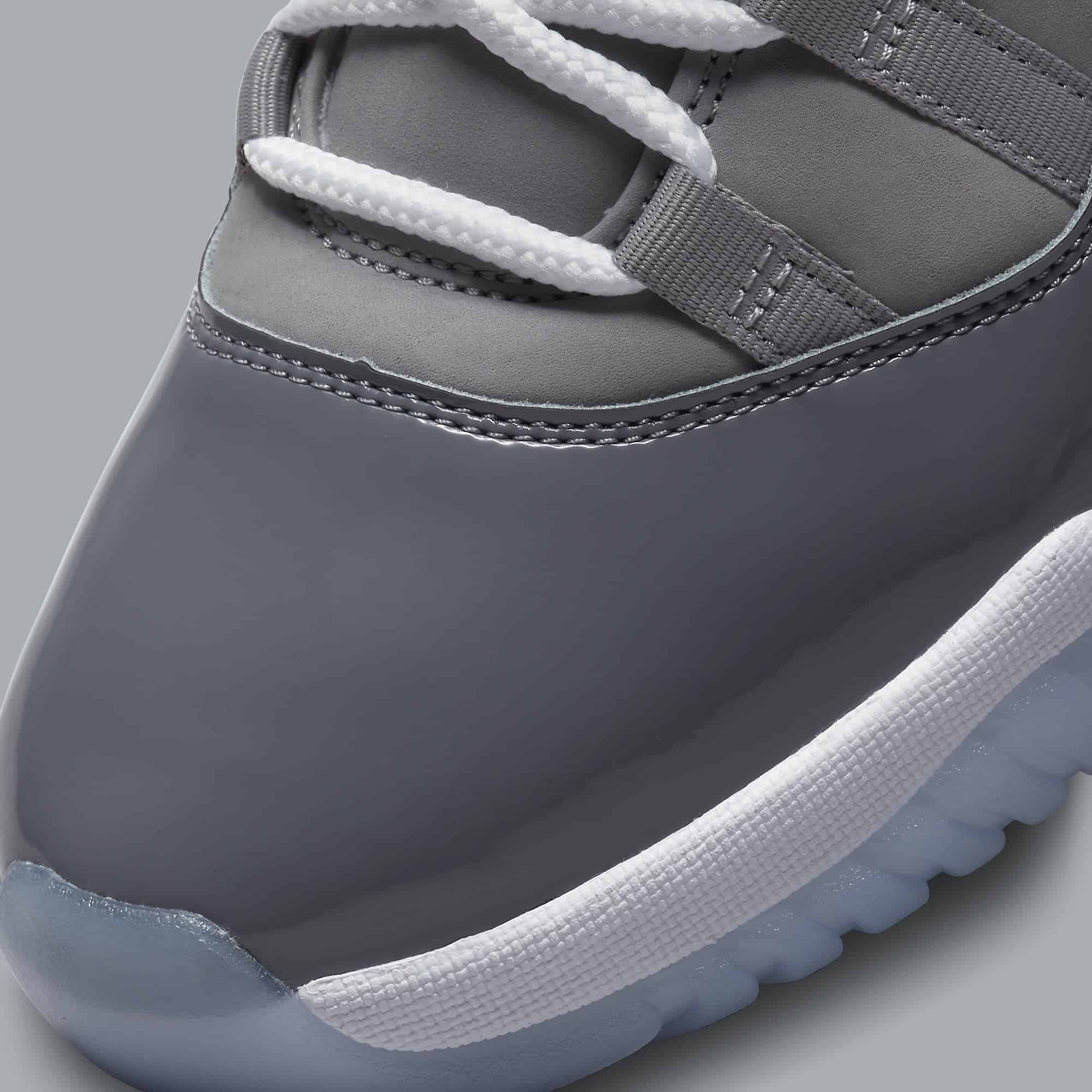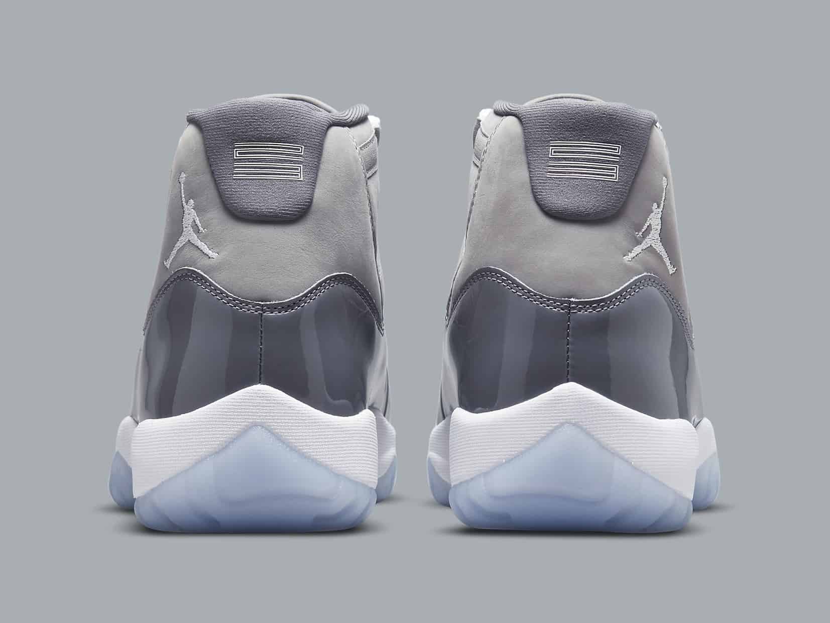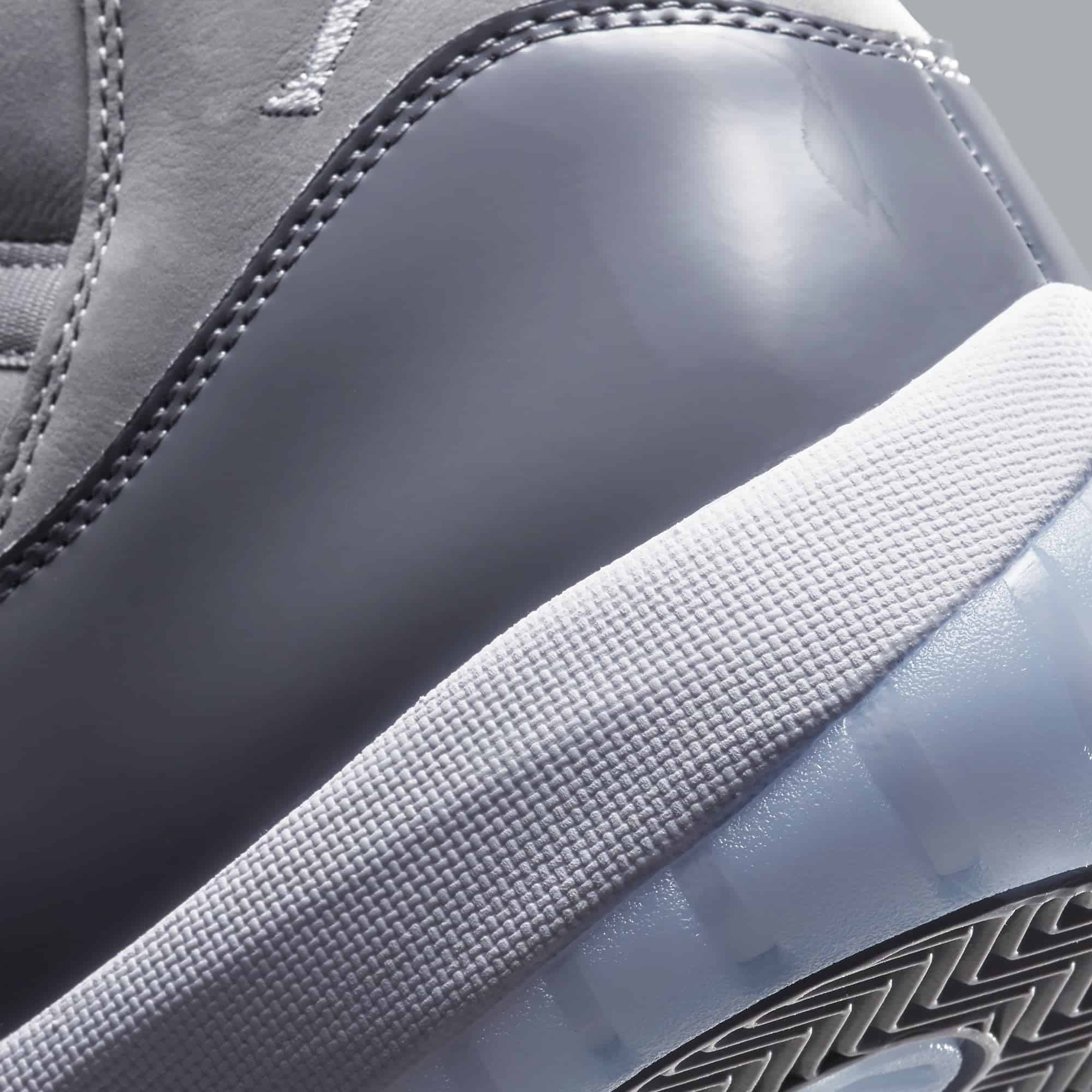 La Cool Grey, portée par MJ lors de son passage aux Wizards, tient une place particulière du fait que l'upper et en cuir très légèrement suédé, abandonnant le révolutionnaire mesh ballistic ce qui en 2001 avait pu être perçu comme une hérésie. Réédité pour la dernière fois en 2010, la Cool Grey revient dans sa conception OG, avec ses deux teintes de gris sur la tige et le patent leather, le tout posé sur une semelle icy. Le Jumpman blanc est assorti à la midsole et aux lacets ronds. Le 23 est bien présent sur le patch en tissu du talon. Le patent leather est quant à lui légèrement rehaussé par rapport à la version OG, se calant sur les premiers prototypes de la 11, tout comme le col qui est droit et là encore un poil plus haut. Le shape est également un peu différent et profilé comme sur le coloris "Jubilee" qui fêtait les 25 ans de la silhouette en 2020, moins rond que les versions rétro auxquelles nous étions habitués.