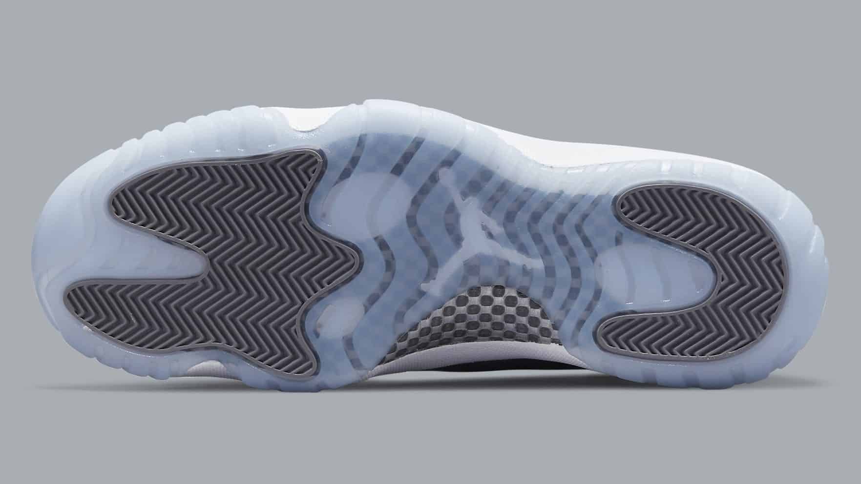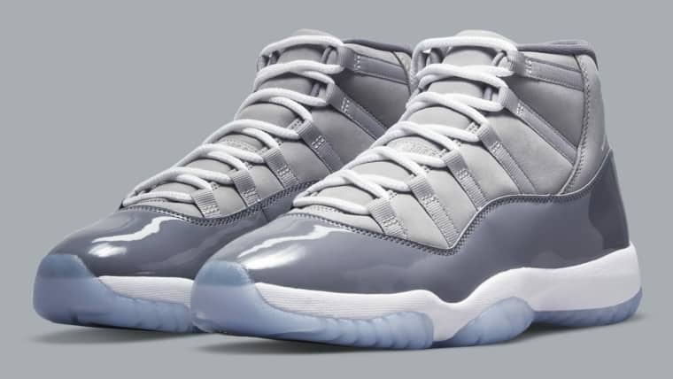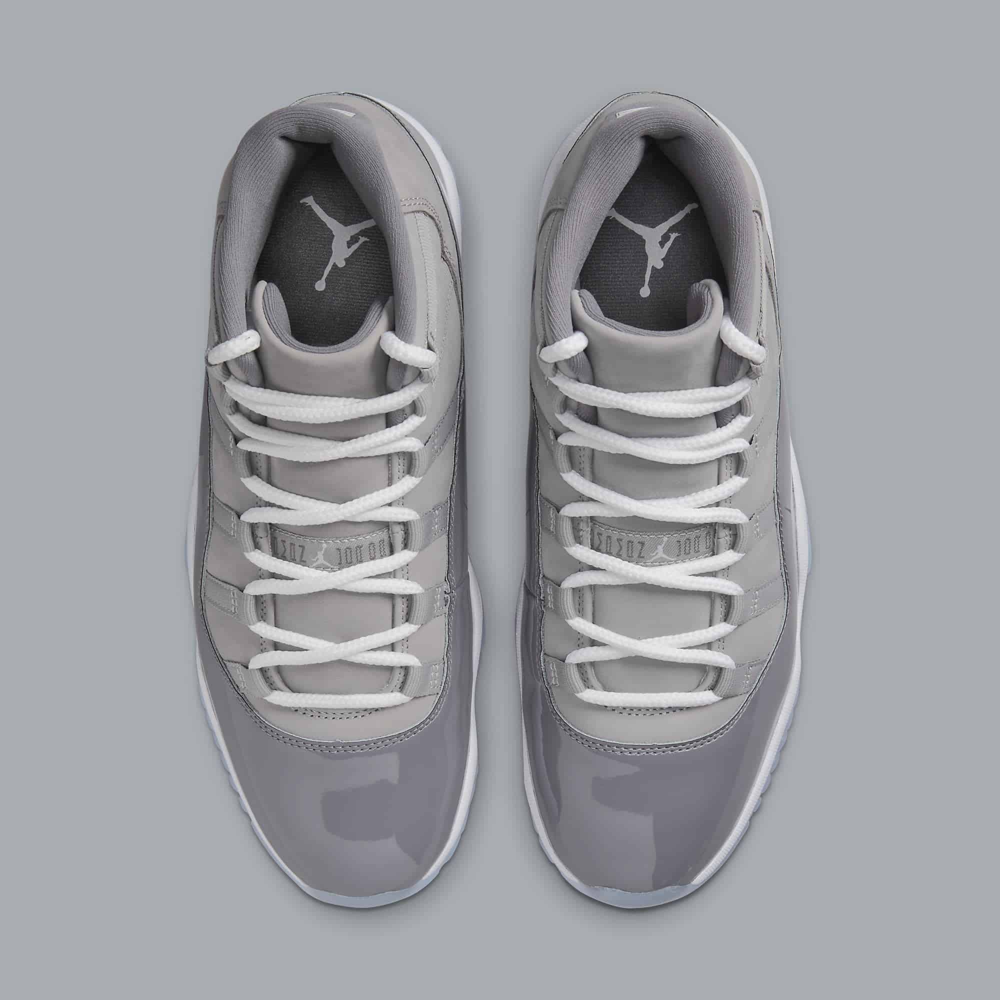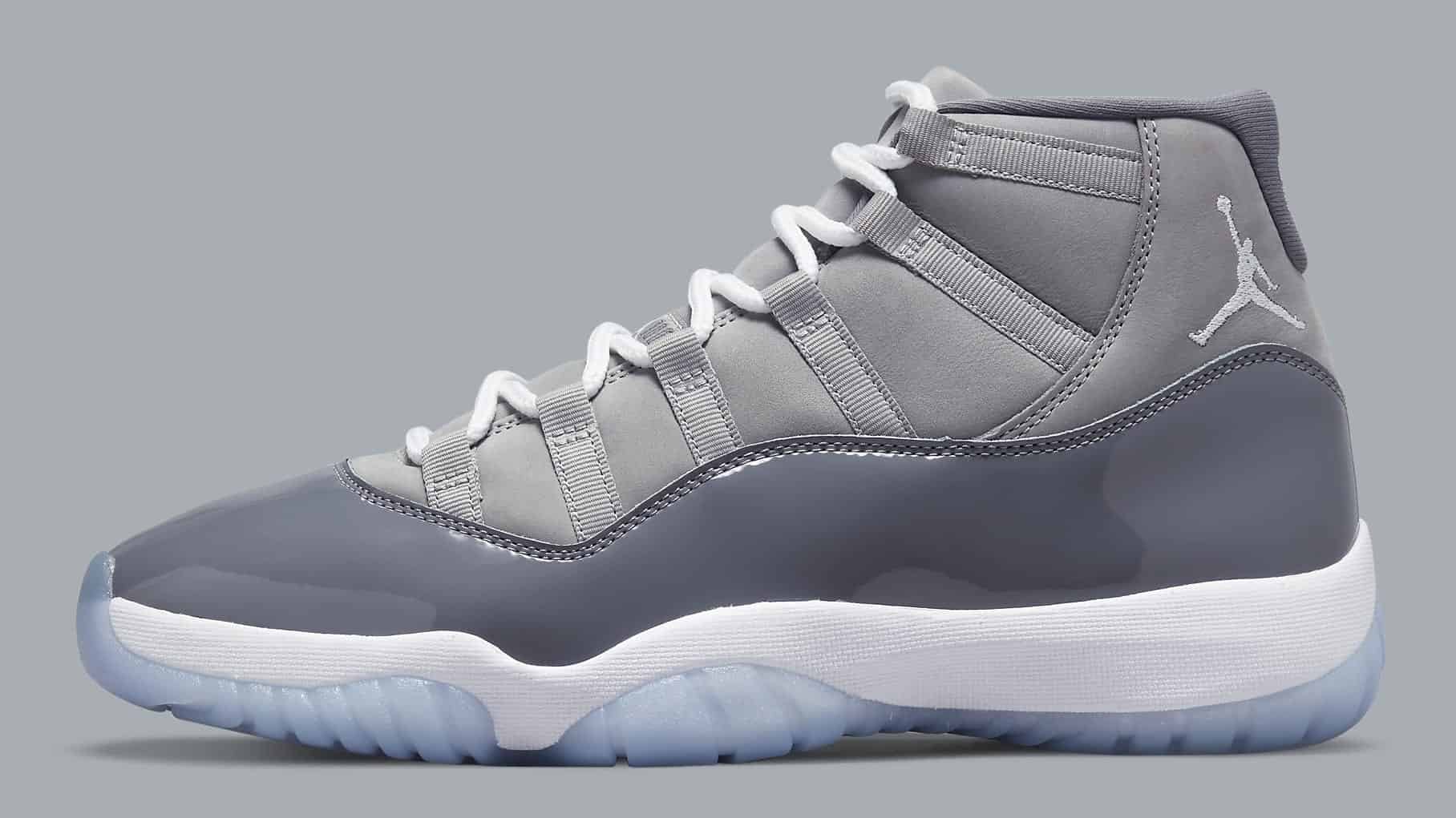 La Cool Grey, portée par MJ lors de son passage aux Wizards, tient une place particulière du fait que l'upper et en cuir très légèrement suédé, abandonnant le révolutionnaire mesh ballistic ce qui en 2001 avait pu être perçu comme une hérésie. Réédité pour la dernière fois en 2010, la Cool Grey revient dans sa conception OG, avec ses deux teintes de gris sur la tige et le patent leather, le tout posé sur une semelle icy. Le Jumpman blanc est assorti à la midsole et aux lacets ronds. Le 23 est bien présent sur le patch en tissu du talon. Le patent leather est quant à lui légèrement rehaussé par rapport à la version OG, se calant sur les premiers prototypes de la 11, tout comme le col qui est droit et là encore un poil plus haut. Le shape est également un peu différent et profilé comme sur le coloris "Jubilee" qui fêtait les 25 ans de la silhouette en 2020, moins rond que les versions rétro auxquelles nous étions habitués.