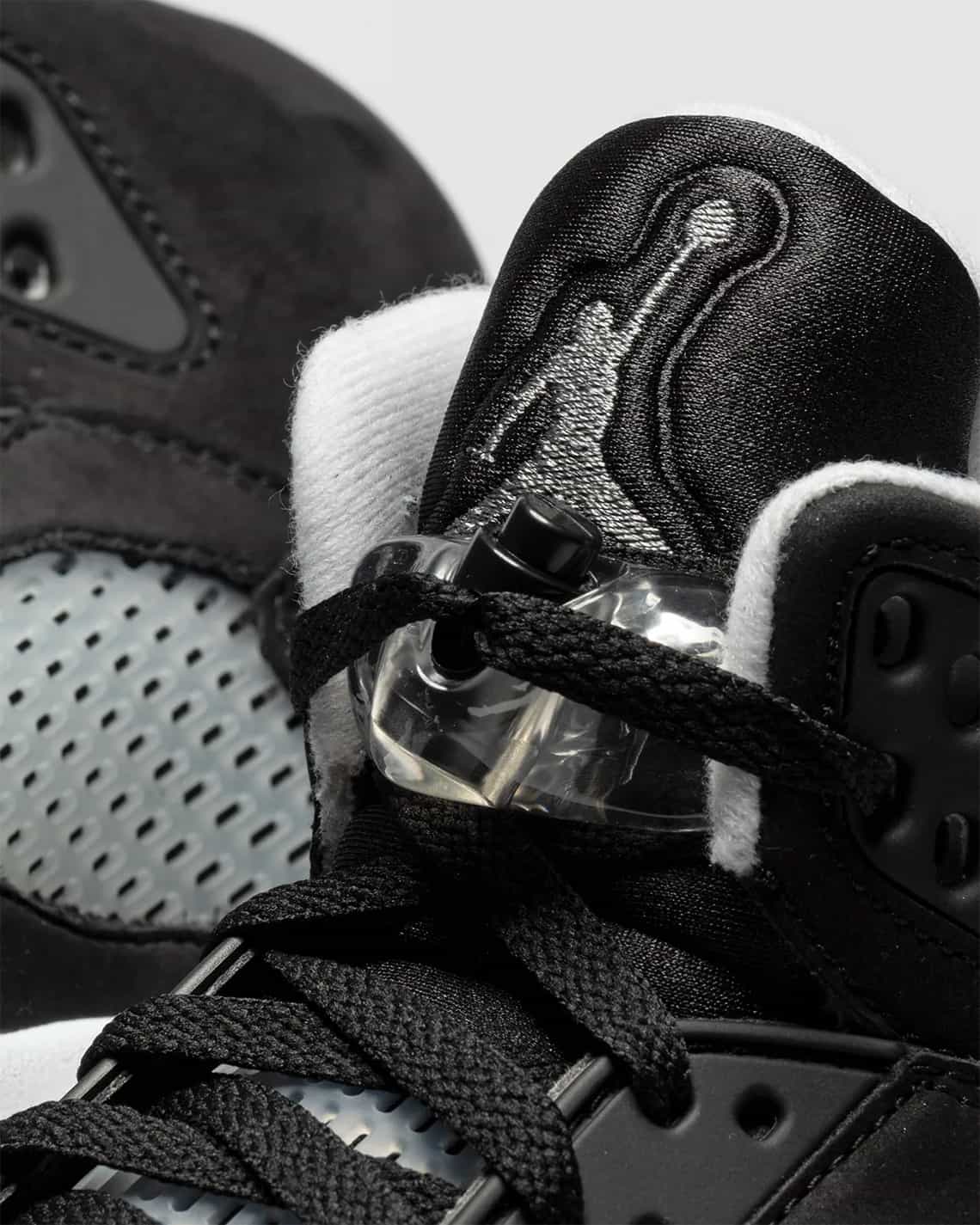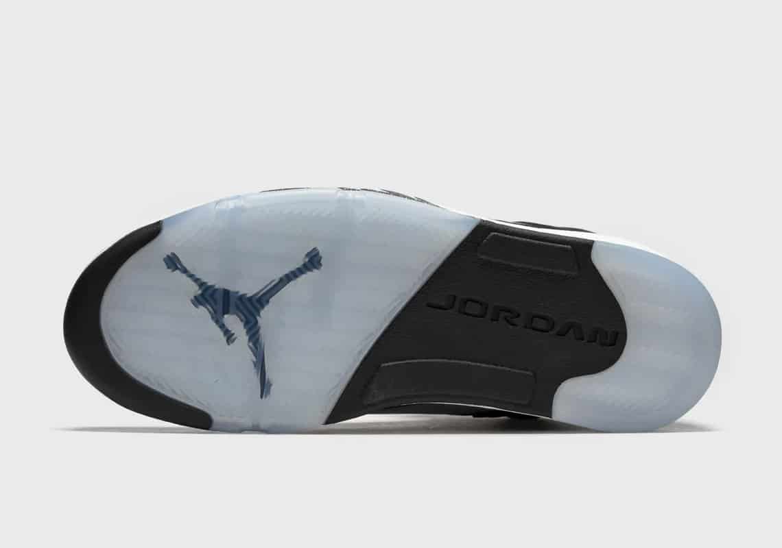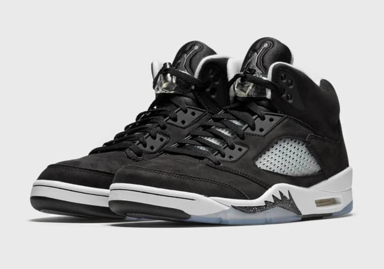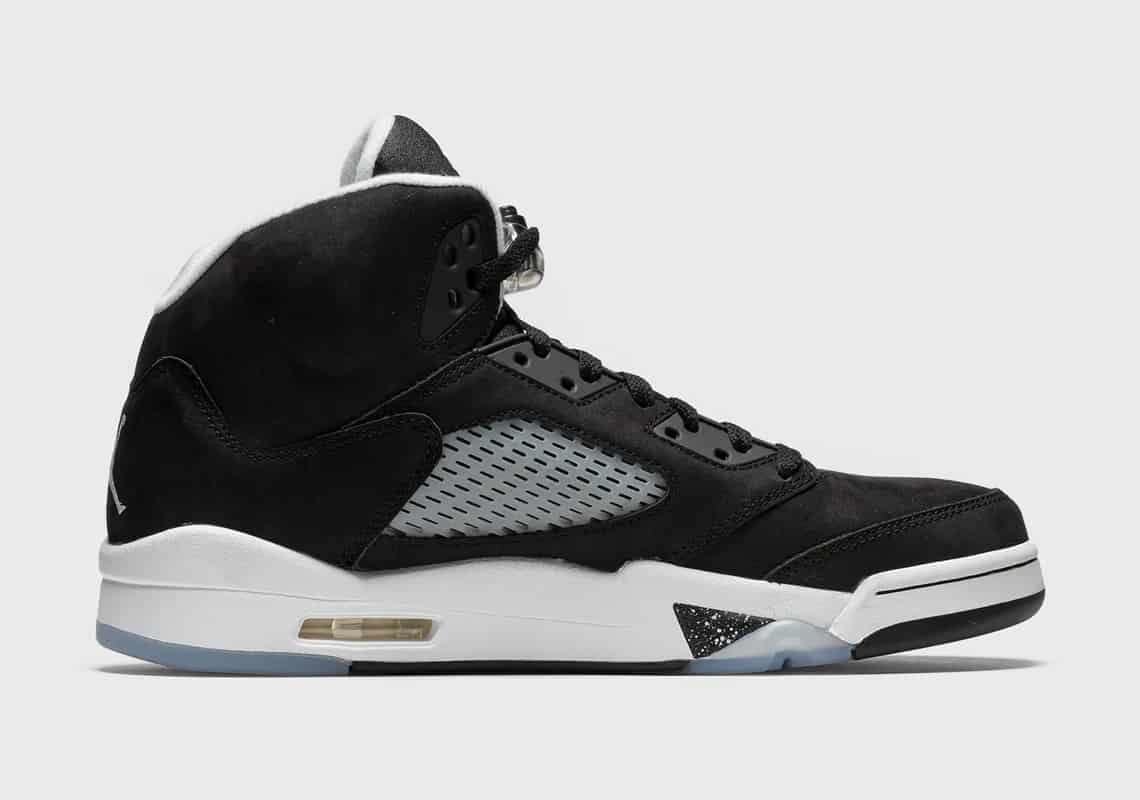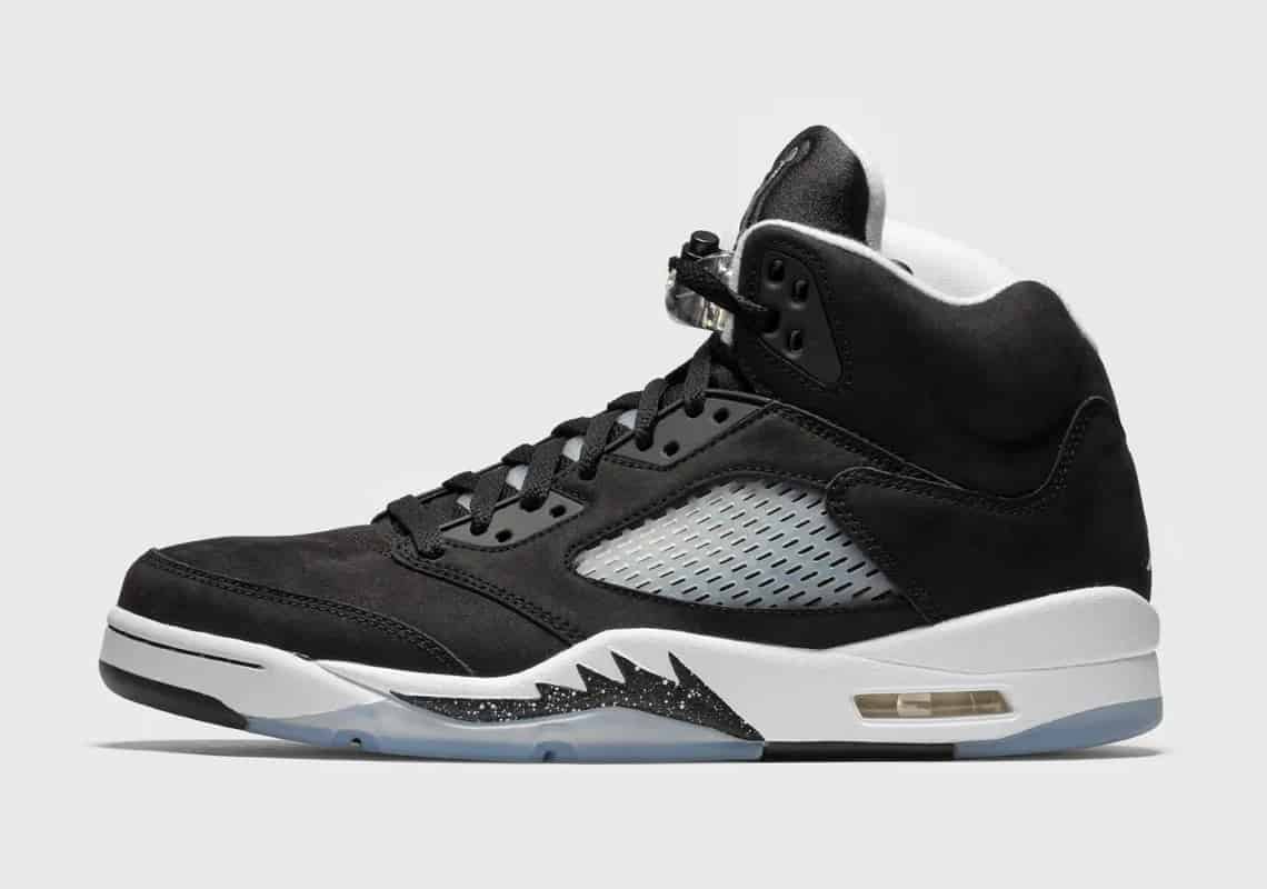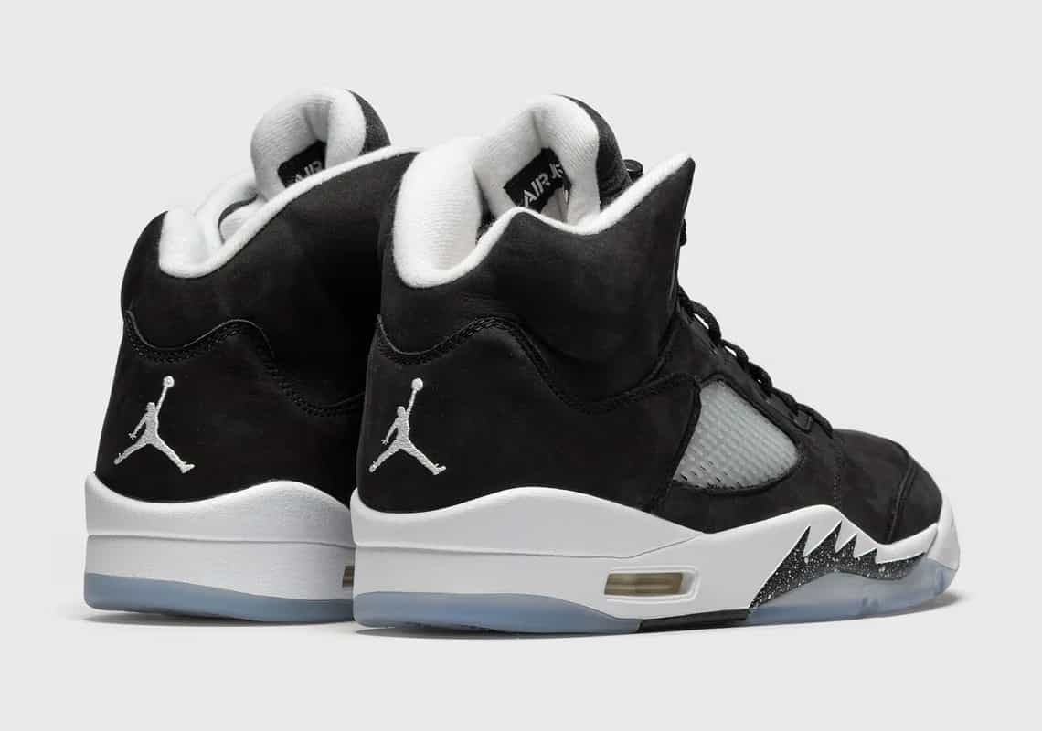 Jordan Brand a pris le parti de ressortir à l'identique la Air Jordan 5 Oreo de 2013. Huit ans plus tard, mais sous un autre nom ("Moonlight"), cette Jojo se couvre de nubuck noir, contrebalancée par du blanc sur la midsole, le col et le Jumpman cousu sur le talon.