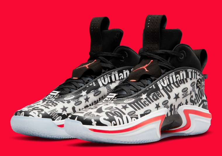 30 ans plus tard, la Air Jordan 36 reprend les lettrages du fameux poster et les pose sur tout l'upper avec des flèches, des étoiles et les mots “LEARN”, “HOW TO PLAY GOLF” et “HOW TO INCREASE YOUR HANGTIME”. Niveau coloris on part sur un classique noir et blanc avec un liseré rouge qui fait le tour du pied.
