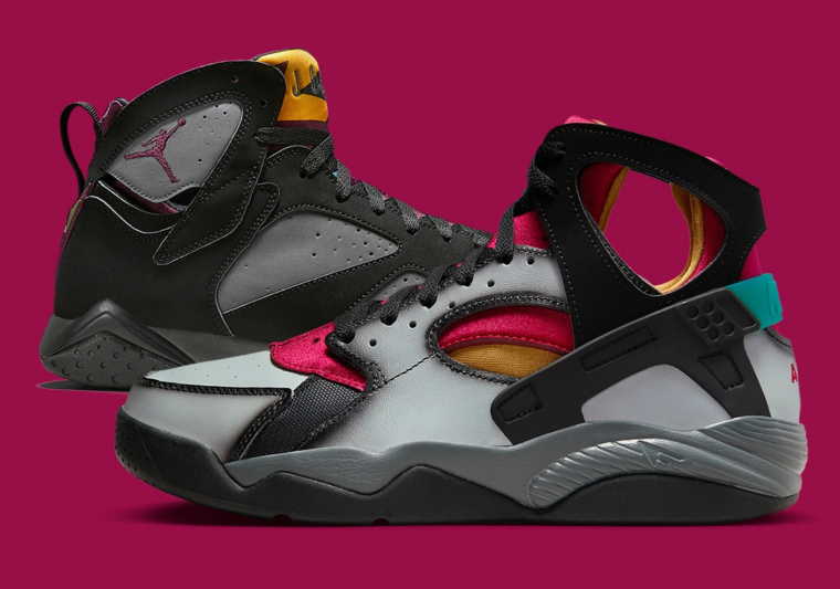 Le coloris Bordeaux est l'un des préféré de la Air Jordan 7 pour tous les fans de la silhouette qui a amené MJ à sa seconde bague de champion et sa seconde médaille d'or avec la Dream Team en 1992. Il a été porté par Jordan lors du All Star Game 92 et surtout dans le clip Jam aux côtés de Michael Jackson. Quelle belle surprise de voir que la Air Flight Huarache popularisée par le Fab Five de Michigan à la même époque va aussi être recouverte du fameux colorway.