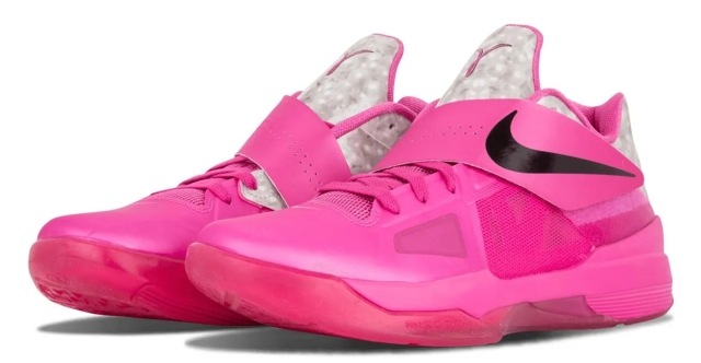 Du rose est posé sur tout l'empeigne et la semelle pour rendre hommage à la tante de Kevin Durant, emportée par un cancer du poumon, complété par un gris cotonneux sur la languette, l'intérieur du pied et le talon. Le Swoosh posé sur le large strap désaxé est en noir, tout comme le logo KD cousu sur le talon.
