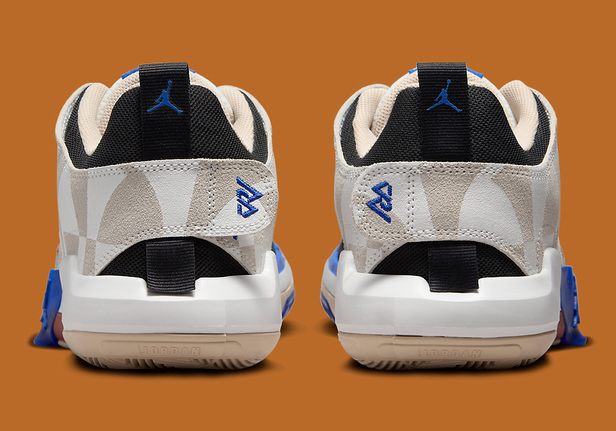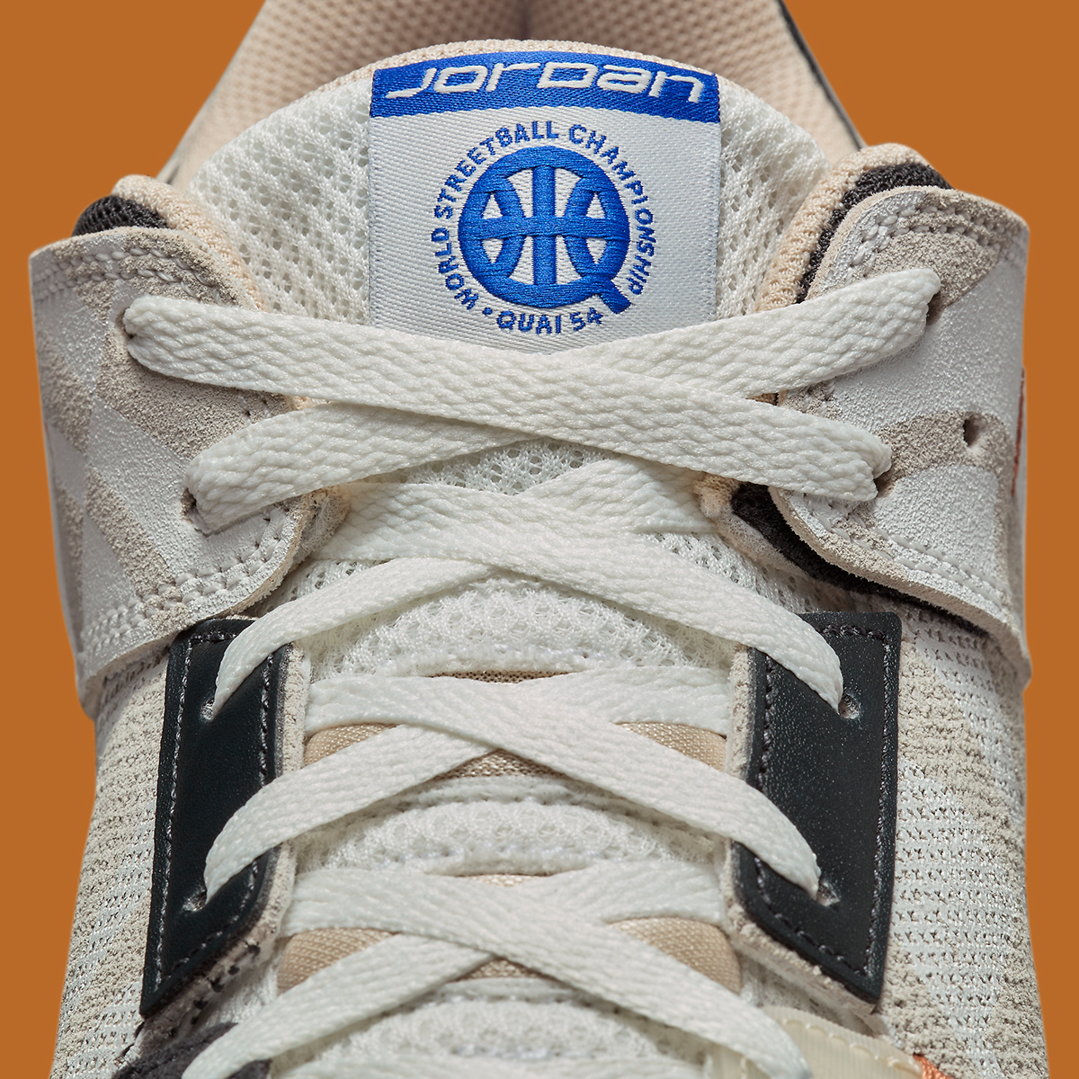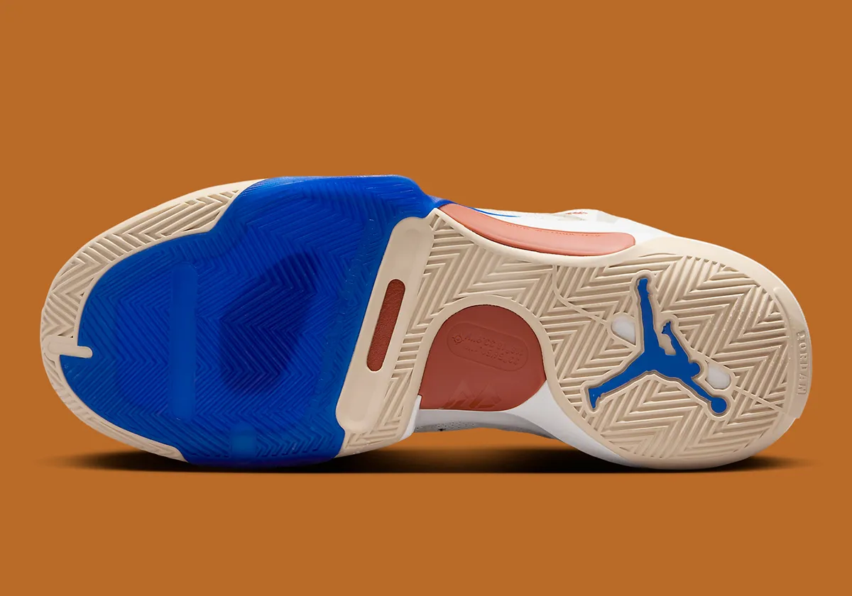 La silhouette sera recouverte du visuel et du code couleur retenus pour 2024, à base de blanc, bleu et marron. On aime beaucoup le gros rappel de bleu sous la semelle qui fait écho au Jumpman, tandis que le désormais fameux logo du Quai trône sur le haut de la languette.
