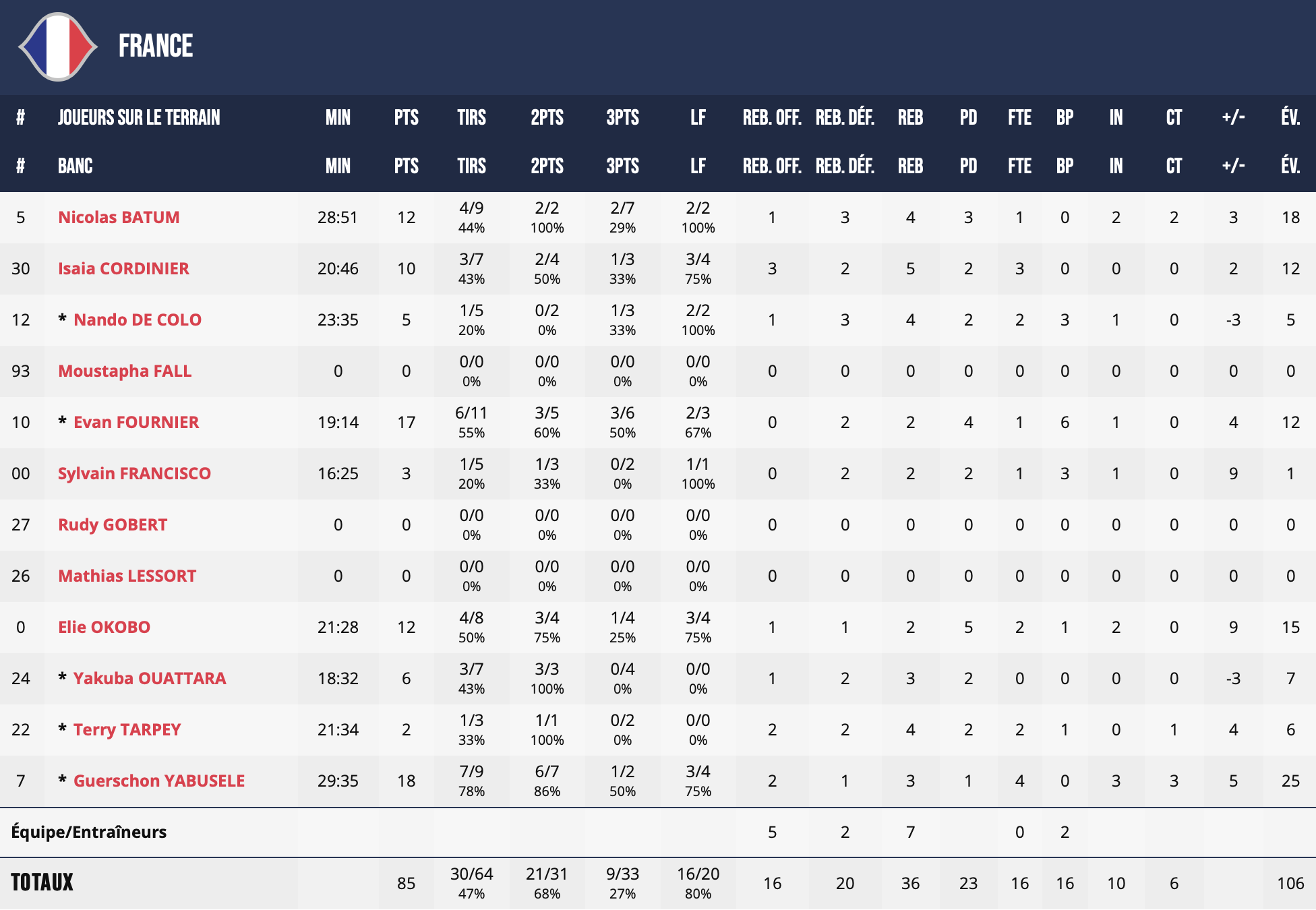La rencontre a été pénible et la victoire laborieuse. Déjà éliminée, la France n’avait rien d’autre à gagner que le match en lui-même. Elle devait donc composer avec le manque d’envie que cela implique et sans Rudy Gobert (cheville), Moustapha Fall (dents), ni Mathias Lessort, qui sera ménagé jusqu’à la fin de la Coupe du monde. Les nerfs n’ont toutefois pas lâché et les Bleus ont résisté au Liban (85-79).