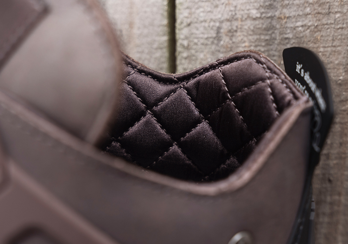 Le col est plus fin que d'habitude, et doublé de satin matelassé, ce qui rend l'ensemble plus premium. Niveau coloris, on reste sur le "taupe", crème et noir classique de AMM, avec en bonus un petit rivet sur la cheville qui reprend le logo de la marque (également placé sur l'étiquette de la languette), et surtout le Nike Air sur le talon pour garder un petit côté OG.