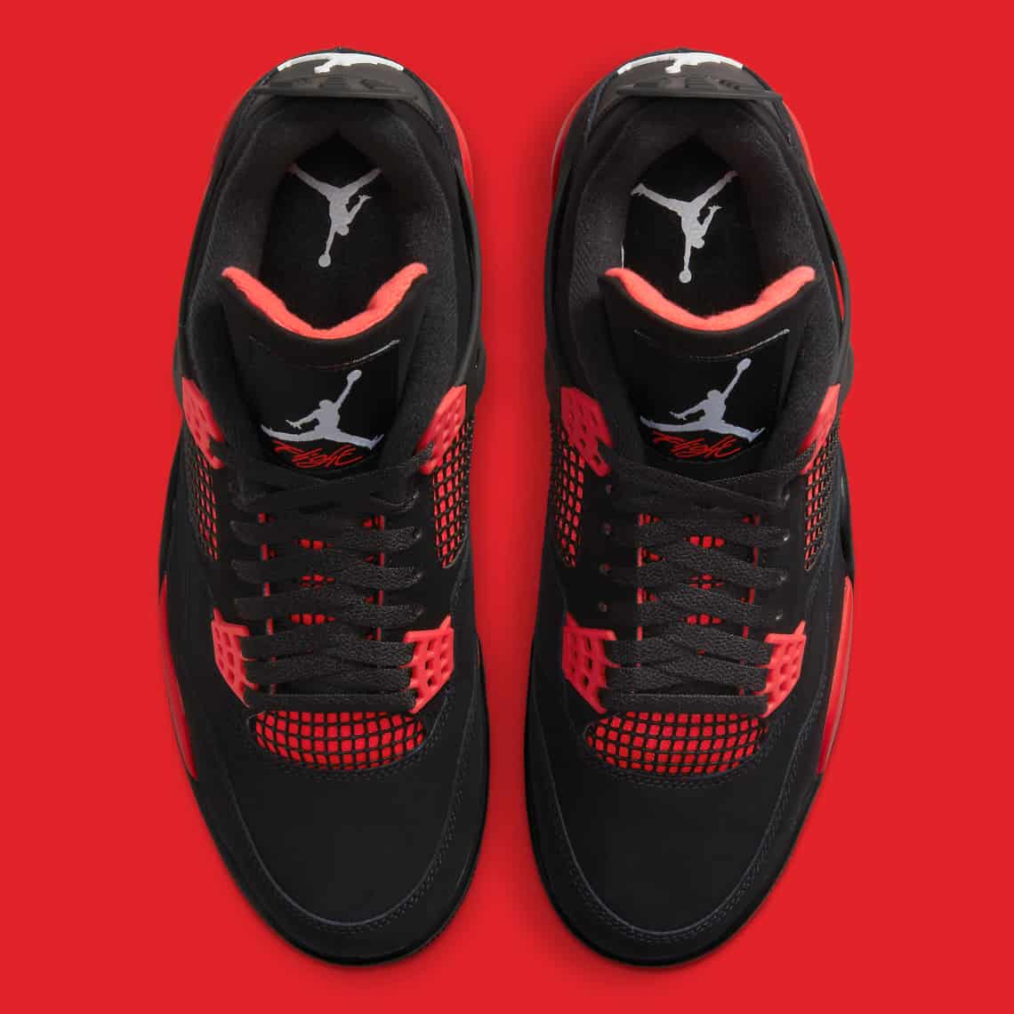 Après la grosse sortie de la Air Jordan 1 Patent Bred il y a iune dizaine de jours, c'est un autre coloris noir et rouge qui débarque cette semaine sur la Jordan 4. Popularisée sur grand écran grâce à Spike Lee dans Do The Right Thing, la silhouette dessinée par Tinker Hatfield en 1989 se drape de nubuck noir très fin, avec des touches de rouge sur la mousse le long de la languette, les eyelets et sous les grilles latérales. Pas d'appellation Bred, ici on parle de Red Thunder !