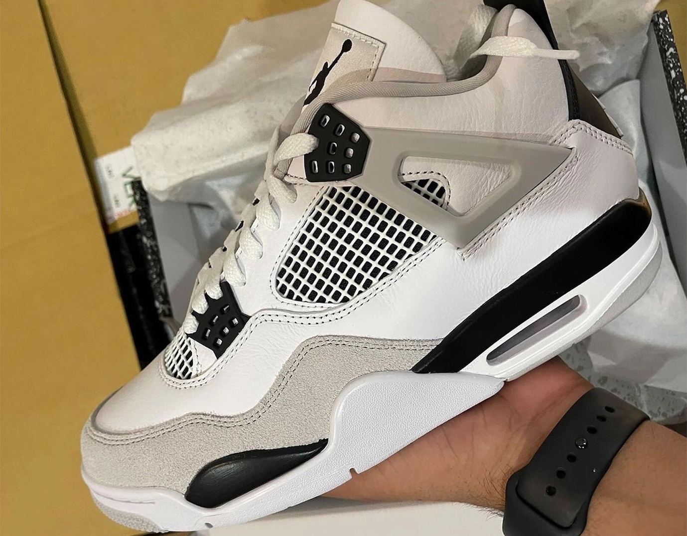 Se basant sur le coloris OG "Military Blue", ici le bleu est remplacé par du noir sur les eyelets, les bandes au dessus de la midsole et sous les grilles latérales. Le reste est en cuir blanc (qui a l'air d'excellente qualité si l'on s'en tient à ces premiers clichés), avec un empiècement de nubuck gris clair sur tout le mudguard. Du noir encore sur le Jumpman de l'étiquette sur la languette et sur le patch de plastique du talon.