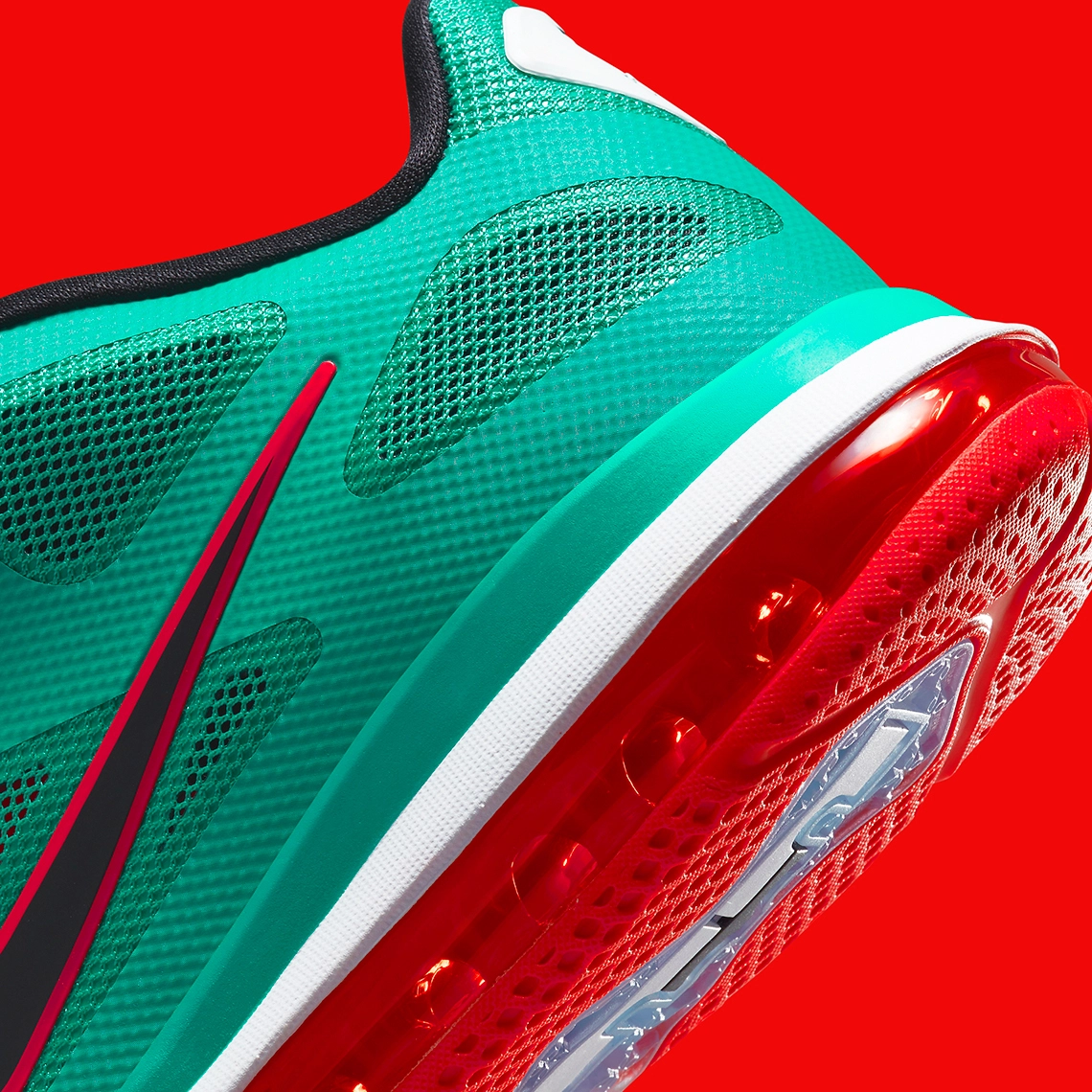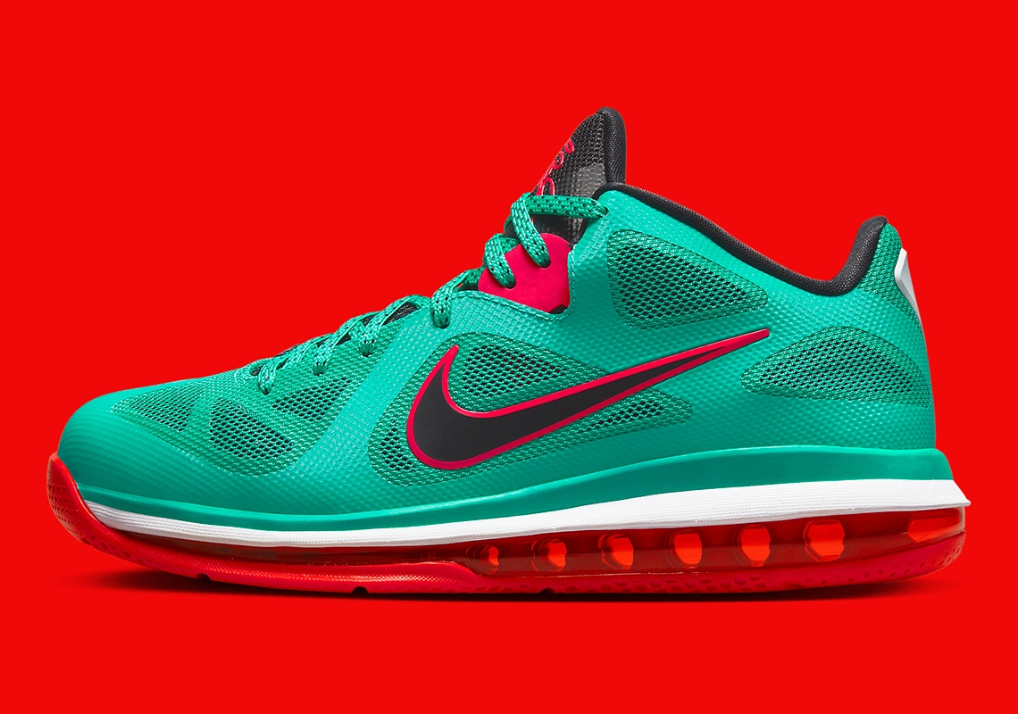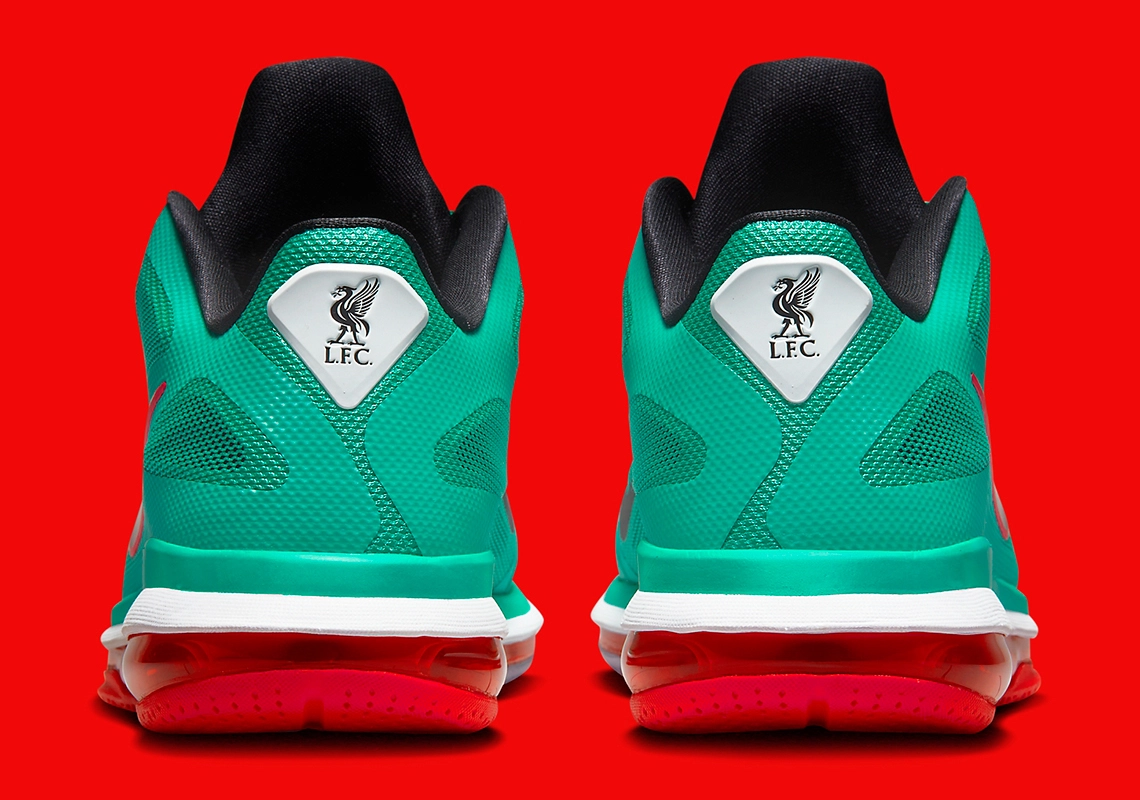 Pas grave pour Nike, qui réintroduit fièrement la LeBron 9 low dans le circuit des silhouettes rétro, et qui plus est avec les couleurs "reverse" du club de la Mersey. Du vert prend la grande majorité du pied, complété par du noir sur la languette et le col, puis du rouge autour du swoosh extérieur, les eyelets et la longue air unit identique à celle de la LeBron 7.