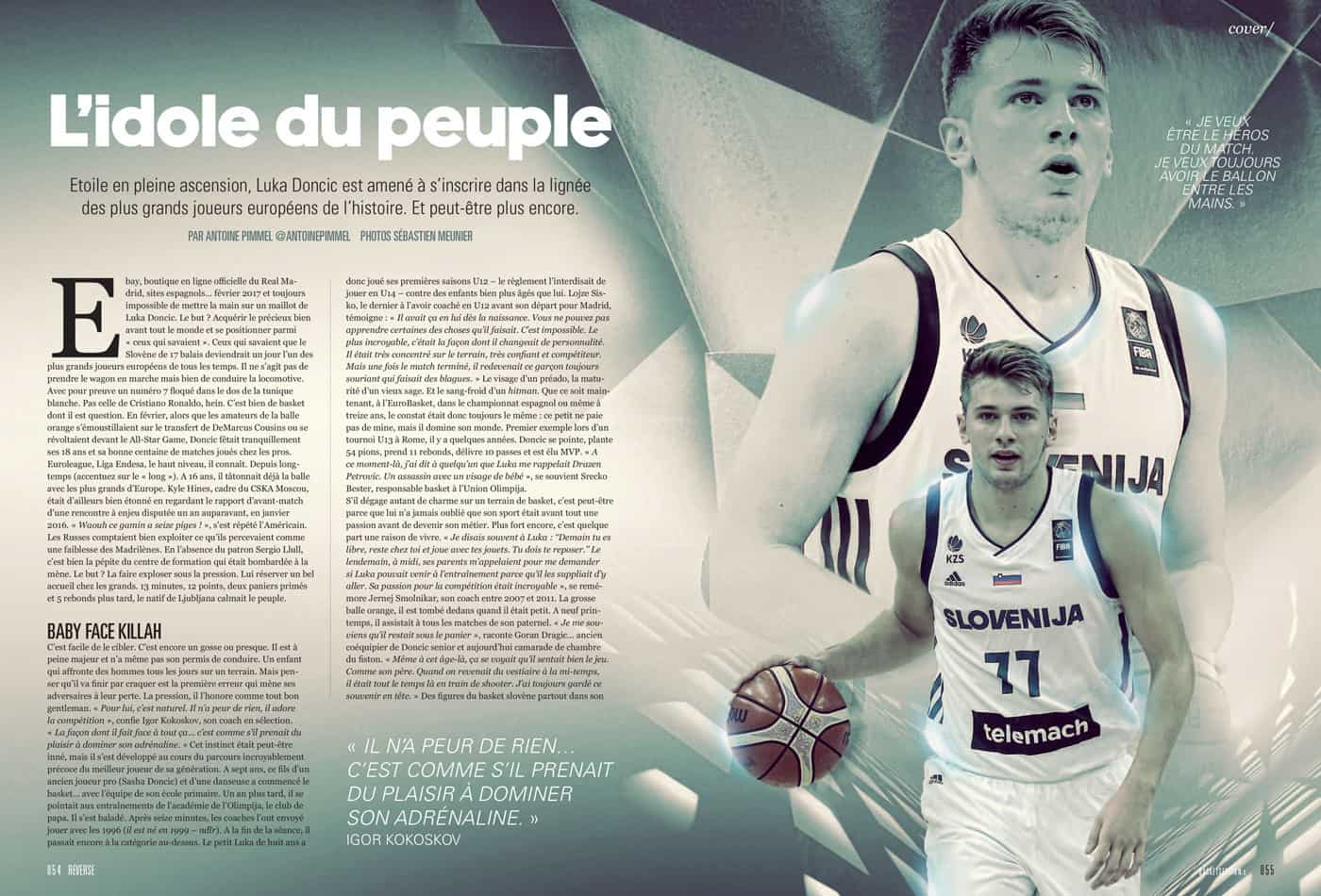 [caption id="attachment_403341" align="alignright" width="300"] Ce portrait de Luka Doncic est extrait du numéro 64 de REVERSE[/caption] Le visage d’un préado, la maturité d’un vieux sage. Et le sang-froid d’un hitman. Que ce soit maintenant, à l’EuroBasket, dans le championnat espagnol ou même à treize ans, le constat était donc toujours le même : ce petit ne paie pas de mine, mais il domine son monde. Premier exemple lors d’un tournoi U13 à Rome, il y a quelques années. Doncic se pointe, plante 54 pions, prend 11 rebonds, délivre 10 passes et est élu MVP.« A ce moment-là, j’ai dit à quelqu’un que Luka me rappelait Drazen Petrovic. Un assassin avec un visage de bébé », se souvient Srecko Bester, responsable basket à l’Union Olimpija.