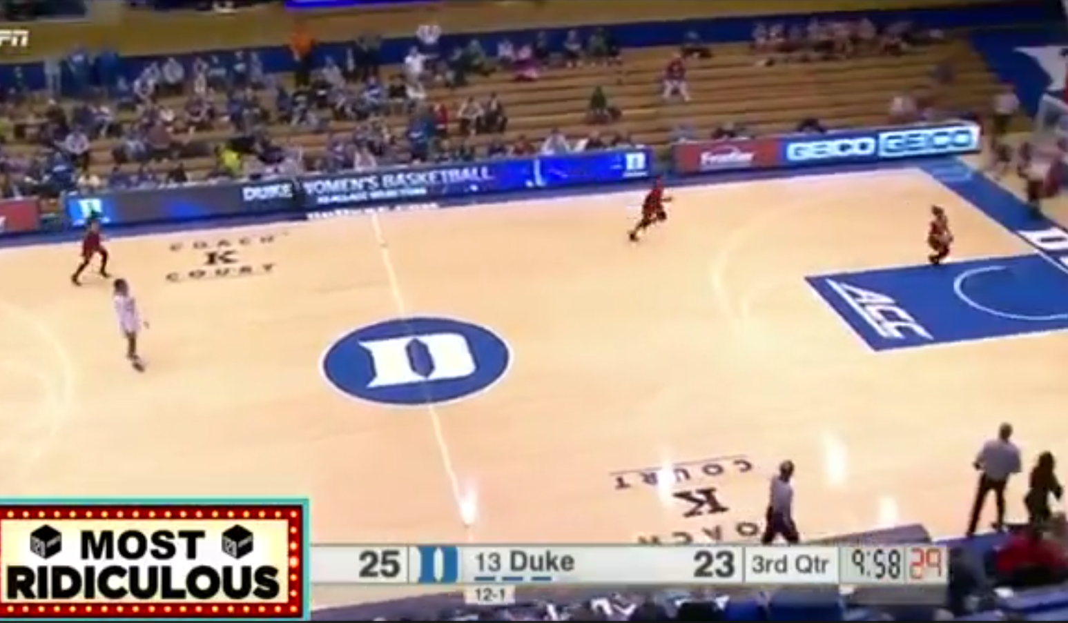 Au sortir de la mi-temps, Jeff Walz, le coach des filles de Louisville, a demandé à ses joueuses de se positionner en attaque... vers leur panier. Un coup de roublardise qui a perturbé les joueuses de Duke et donné cette scène absolument surréaliste.