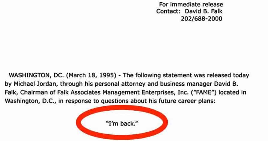 "Vous pourriez avoir Elvis Presley en première partie du concert de réunification des Beatles avec un combat de Mike Tyson dans la foulée, que ce ne serait pas suffisant pour faire mieux que le retour de Michael Jordan à Chicago".Michael Jordan : les 20 plus grands moments de His Airness