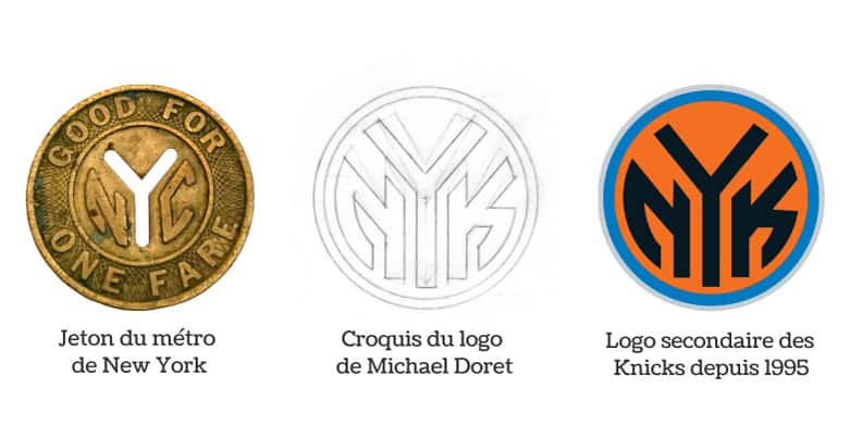 Si la commande de la NBA passée auprès de Doret concernait l’élaboration d’un logo principal, le designer a également travaillé sur une série de logos simplifiés. Mais en 1992, aucune de ses esquisses n’a été retenue. Si l’histoire aurait pu s’en arrêter là, Doret révèle que les Knicks ont utilisé l’un de ses croquis comme logo secondaire (voir ci-après) sans le rémunérer pour les droits d’auteur. Ce petit logo rond, inspiré des jetons du métro new-yorkais, a été notamment présent pendant très longtemps au dos des maillots des Knicks.