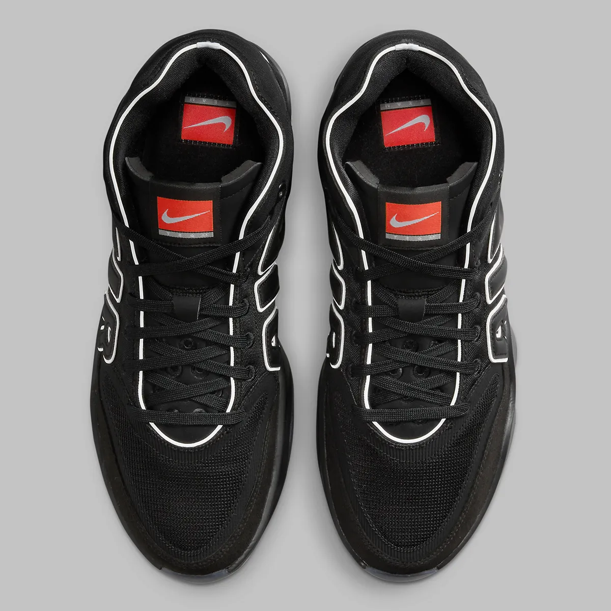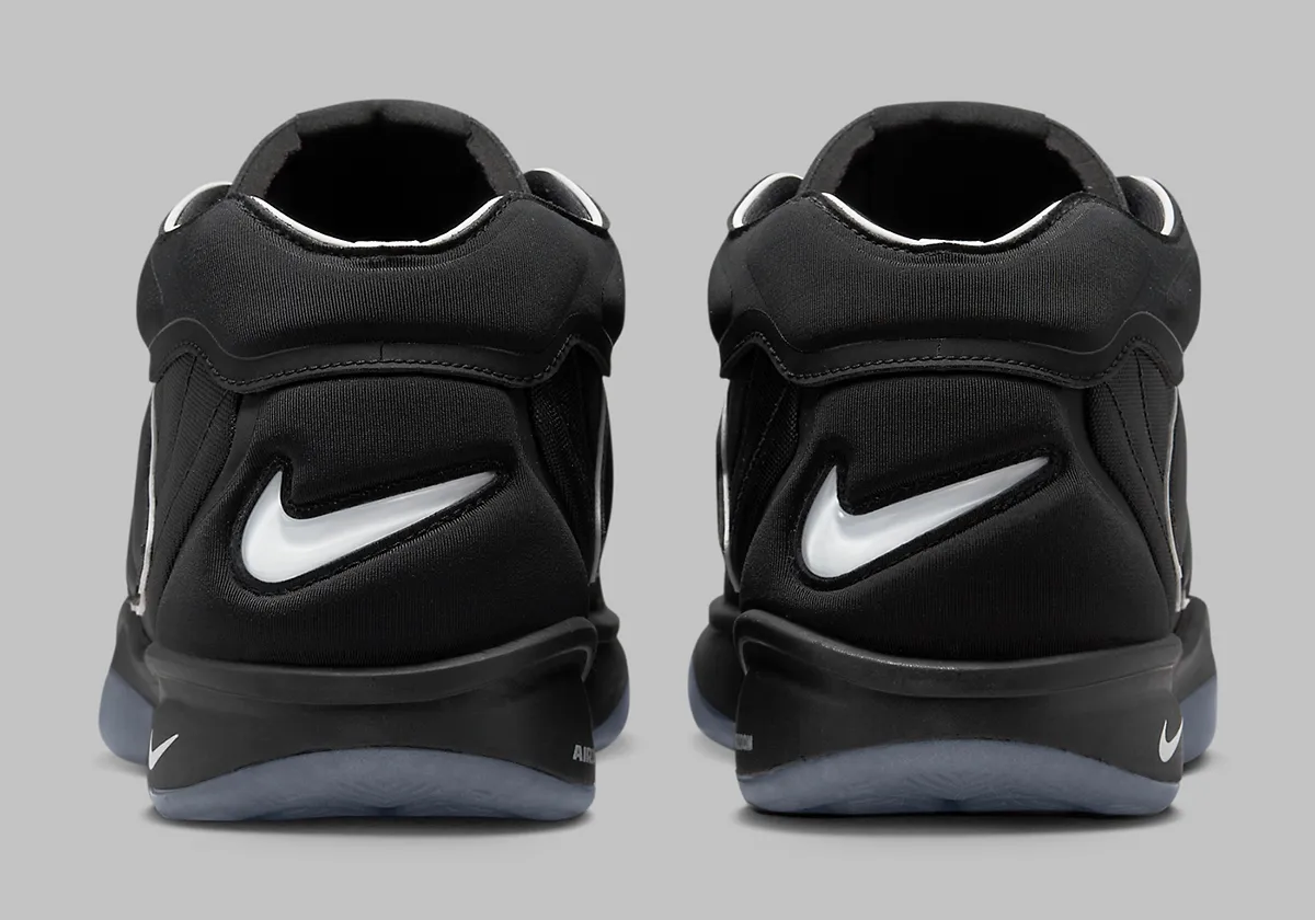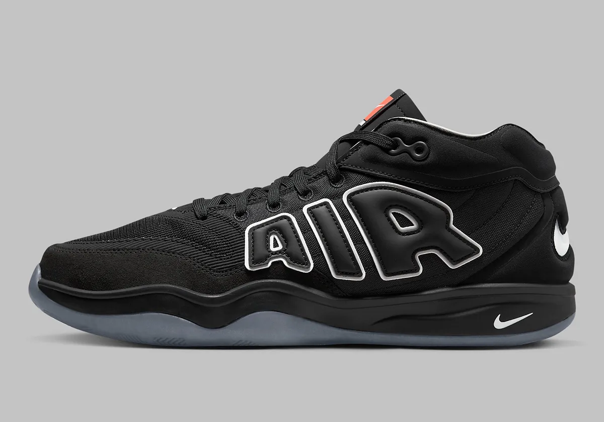 Nike a décidé cette année de rendre hommage à certains modèles iconiques en les déposant sur de nouvelles silhouettes, comme c'est le cas avec la toujours aussi prisée Air More Uptempo chère à Scottie Pippen et à tous les fans de kicks estampillés 90s. C'est la GT Hustle 2 qui sert de cobaye à cette drôle d'expérience et ce n'est pas vraiment un hasard tant cette paire pourrait être sortie elle aussi en 1996 comme sa glorieuse ainée. Elle est donc recouverte de noir avec les emblématiques lettres AIR sur le côté, le swoosh transparent sur le talon et une étiquette rouge sur le haut de la languette.