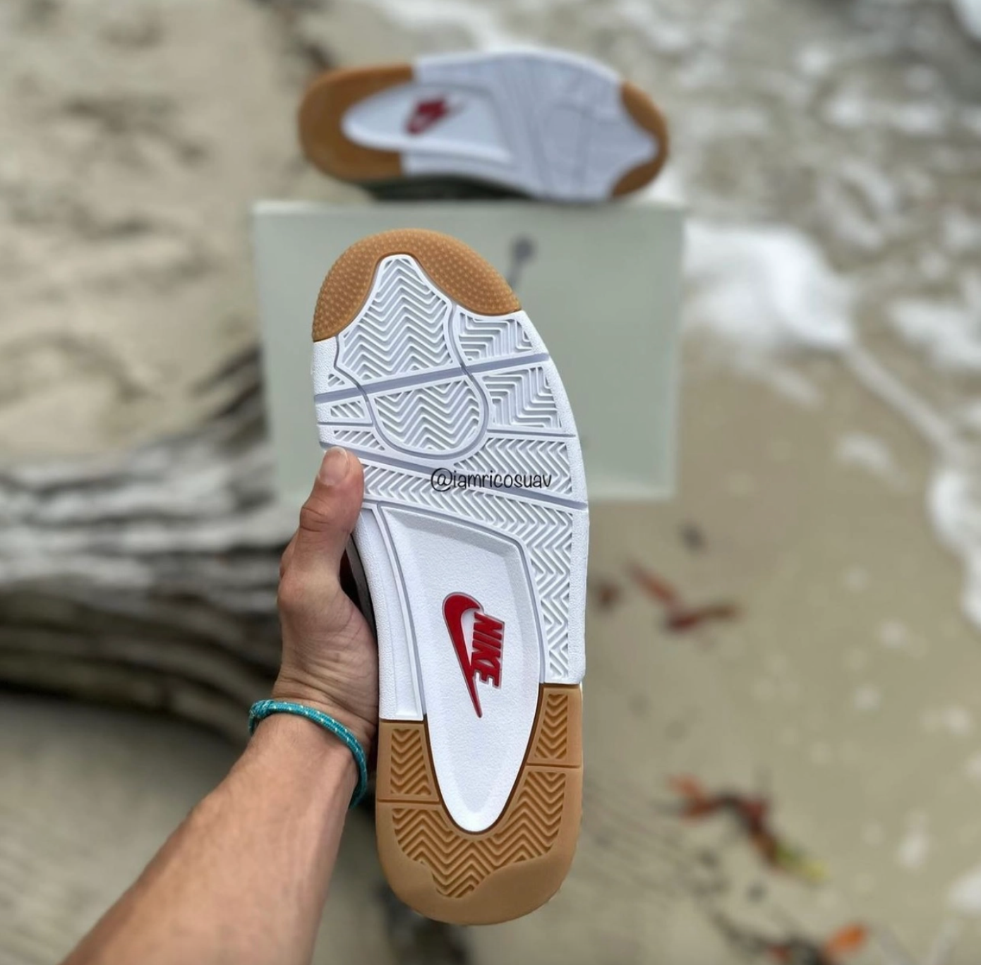 La collab entre Jordan Brand et la division skateboard de Nike se précise et va voir le jour à la fin du mois. Il va donc bien s'agir d'une Jordan 4 sur un coloris blanc beige, avec un mudguard en nubuck à la manière des coloways "military", puis un vert Pine Green sur la midsole, les eyelets, l'intérieur du col, la languette et le talon. A noter le joli contraste rouge du Jumpman placé sur l'étiquette principale, et le Nike SB sur l'arrière à la place du traditionnelle Nike Air.