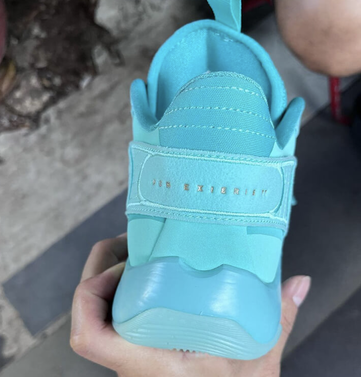 Le coloris bleu turquoise est présent partout, à part quelques touches dorées sur le logo du joueur et le dernier eyelet. Le même doré qui se place en éclaboussures sur les renforts latéraux en plastique blanc.