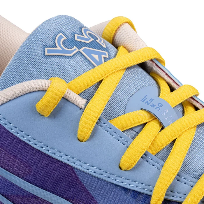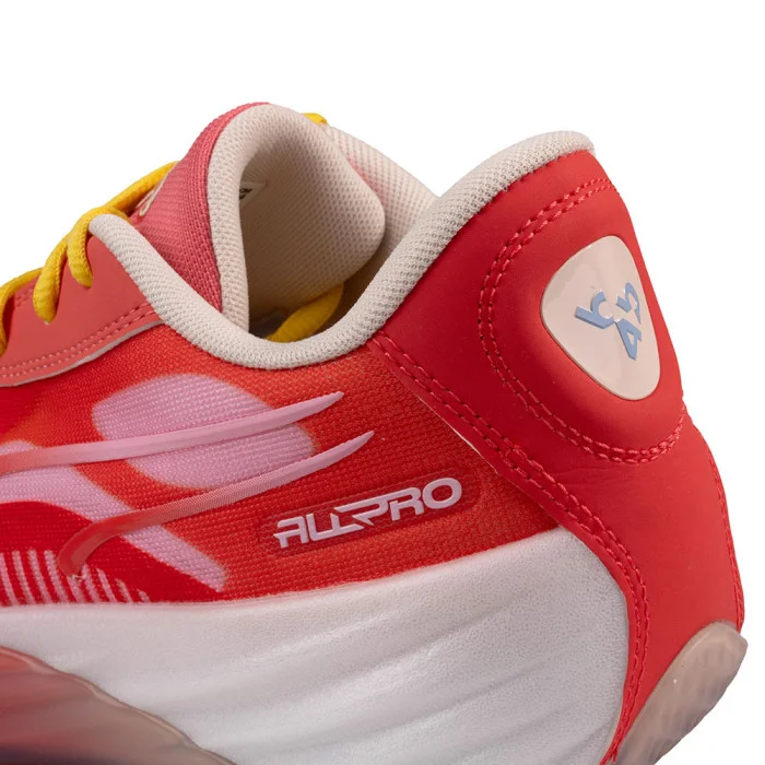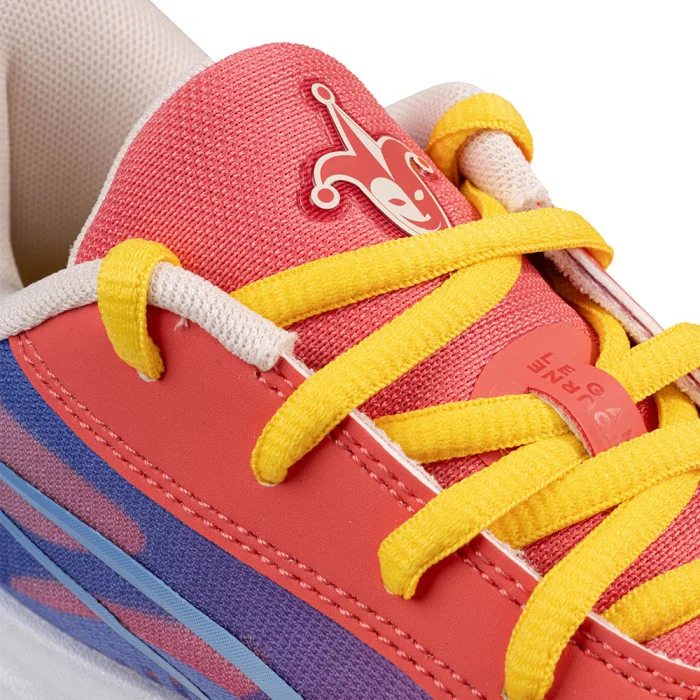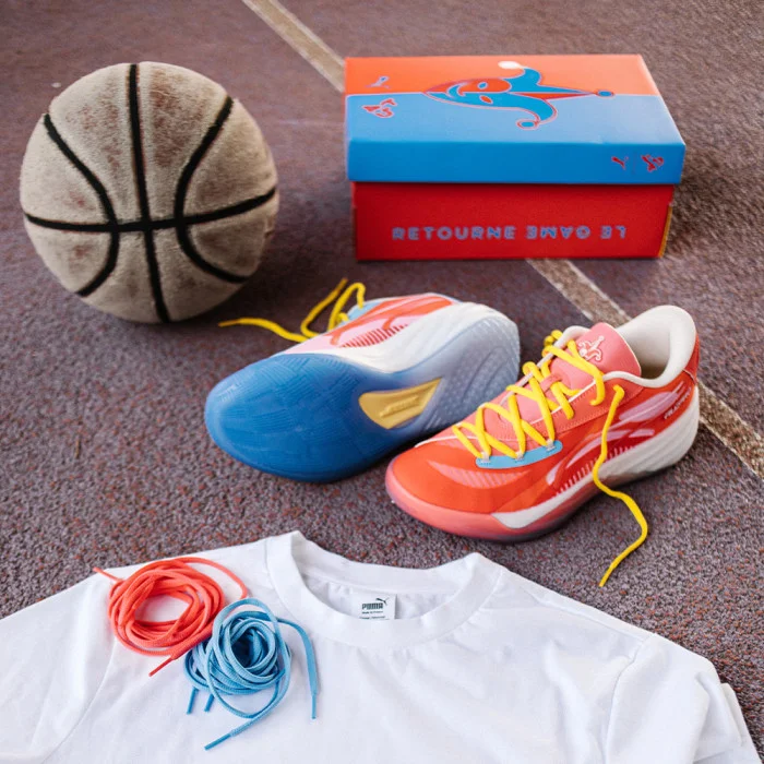 C'est grâce au soutien de sa grand mère que Gilles Bollinger a pu mener à bien son projet, et il a toujours considéré qu'elle avait été comme son joker, la pièce manquante à cette aventure. Et c'est ce nom que reprend Puma sur sa All Pro Nitro, un hommage à l'esprit communautaire du basketball, avec un coloris mismatch bleu et rouge, complété par du jaune sur les lacets (deux autres jeux sont contenus dans la special box). Les logos Puma et b4b sont placés sur les talons, et un joker dessiné sur la semelle intérieure et la languette.
