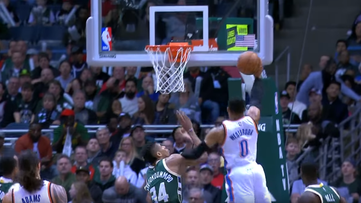 Contrer la boule d'énergie qu'est Russell Westbrook quand il attaque le cercle n'est pas chose aisée. Sauf si on s'appelle Giannis Antetokounmpo évidemment...