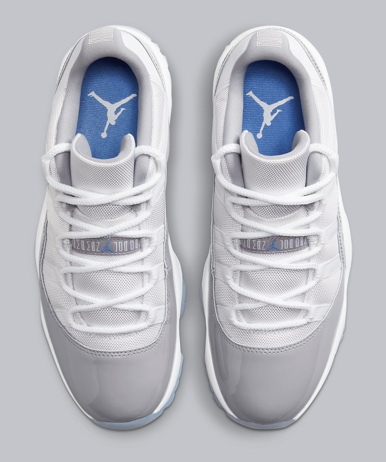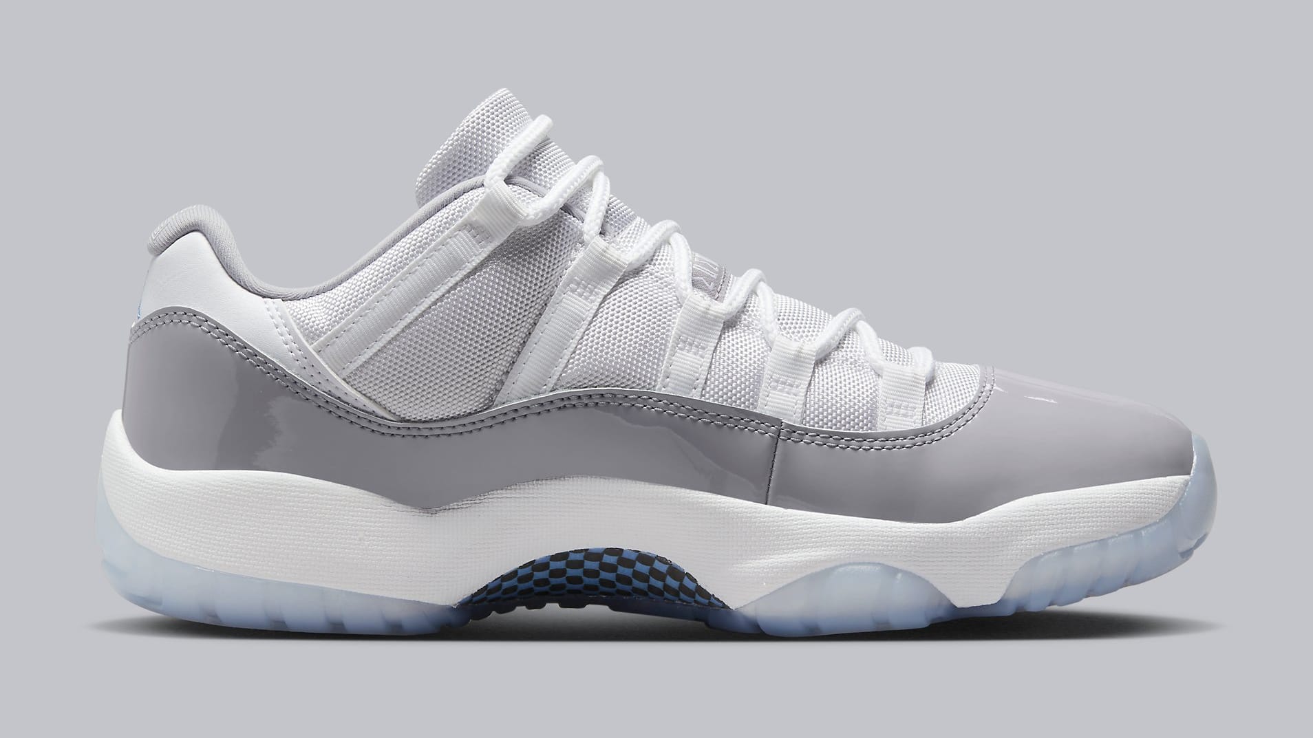 L'upper est recouvert de mesh ballistic blanc, avec un patent leather gris ciment (celui qui a fait la gloire de la Jordan 4, et qui est plus clair que le Cool Grey adoré des fans de la 11). On valide le petit Jumpman bleu que l'on trouve sur l'étiquette de la languette et le talon, également assorti au bleu de la semelle intérieure.