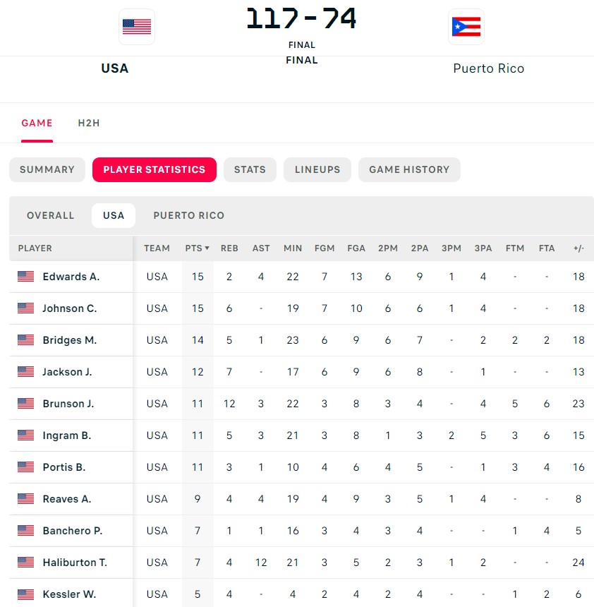 Team USA a mis un peu plus d'une mi-temps à vraiment se détacher et à creuser l'écart au-delà des 10 points. Anthony Edwards (15 pts), Cam Johnson (15 pts) et Mikal Bridges (14 pts) ont été les plus saignants offensivement, mais il faut aussi retenir les 12 passes de Tyrese Haliburton en 21 minutes, avec le meilleur +/- de son équipe, mais aussi le double-double de Jalen Brunson (11 pts, 12 rbds), annoncé comme le "leader naturel" de l'équipe par Steve Kerr lui-même.