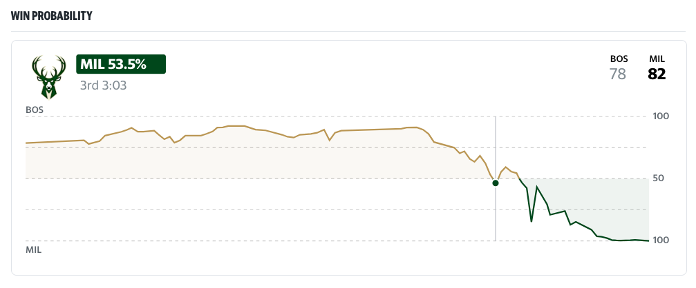 Il reste alors trois minutes à jouer dans le troisième quart-temps. Boston n’est qu’à quatre points des Bucks, 78-82. Le match est encore là, bien vivant. Et pourtant.