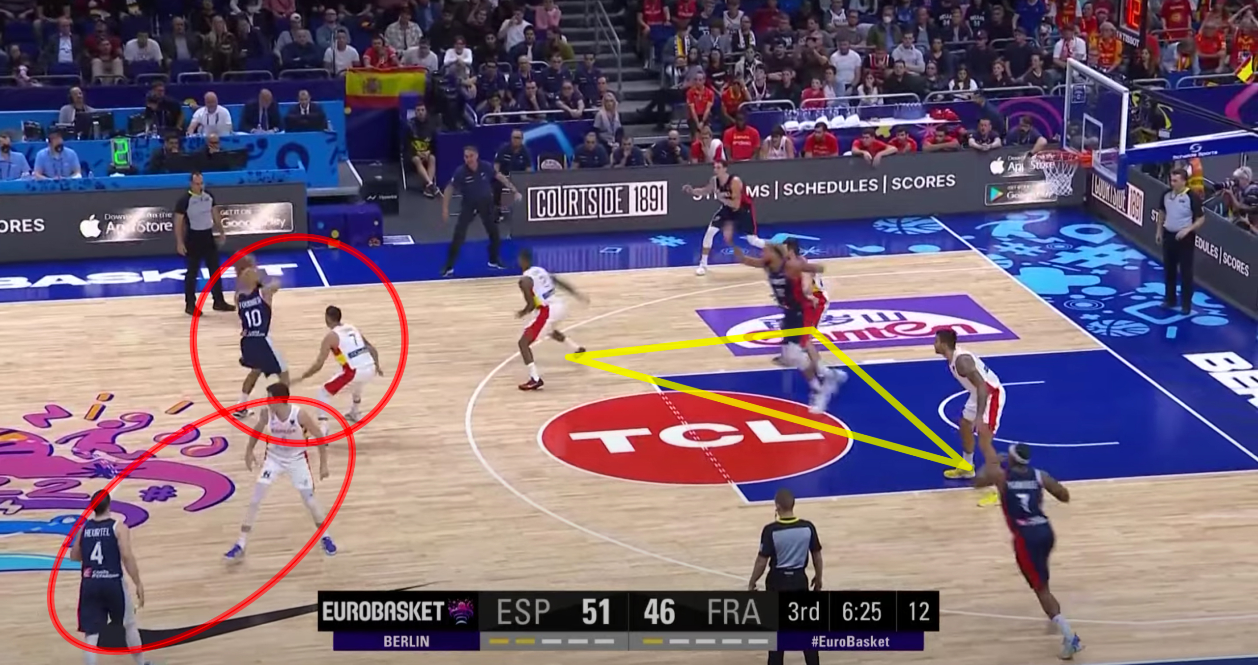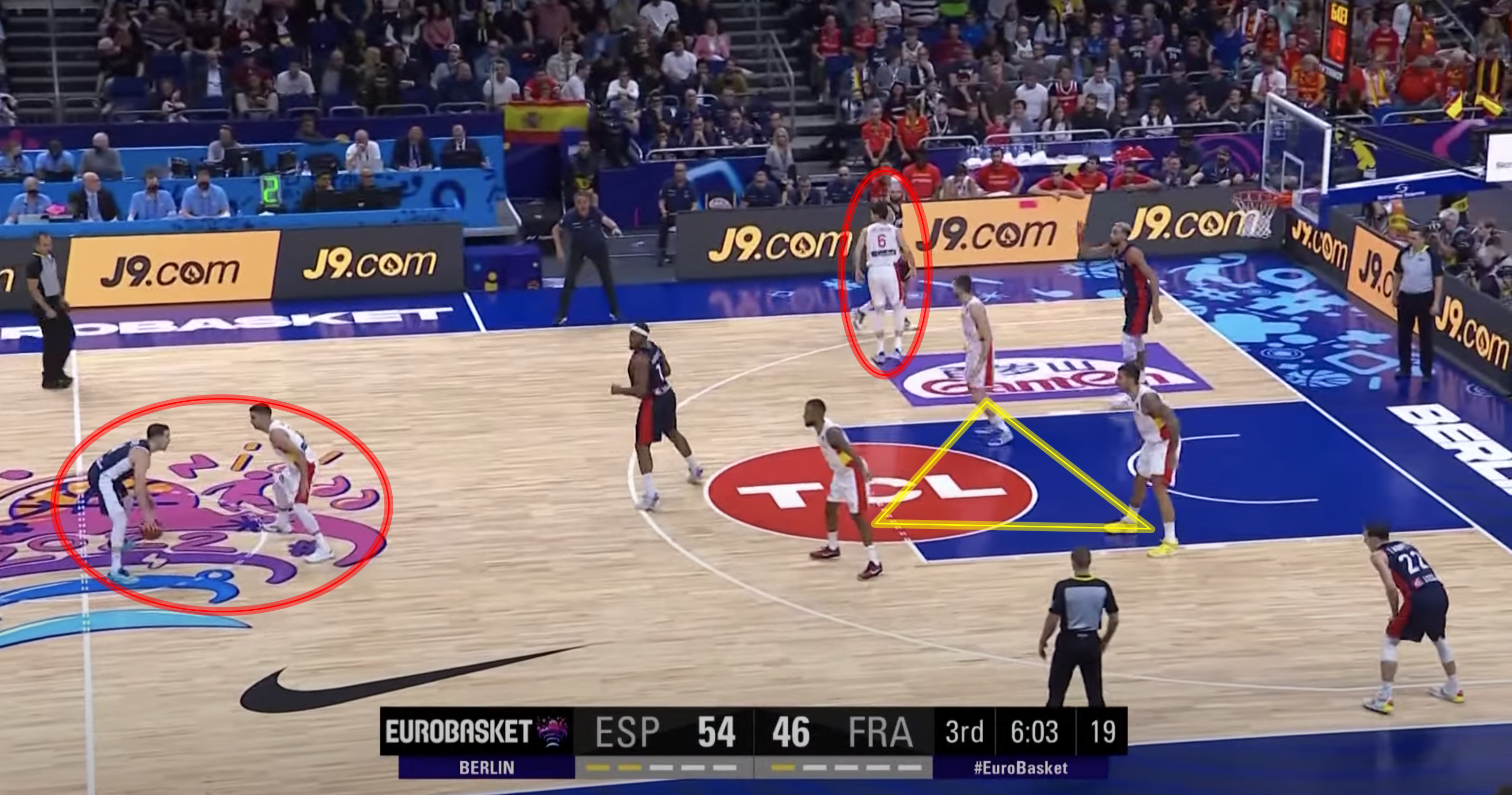 Le deuxième exemple n’est pas forcément un bon souvenir pour nous Français car il s’agit de la finale du dernier Eurobasket entre l’Espagne et la France. Après un run (9-2) des Bleus lors des trois premières minutes du 3e quart-temps qui leur ont permis de recoller à 3 points des Espagnols, Sergio Scariolo, qui avait déjà utilisé une Box-and-1 plus tôt dans le match, organise sa défense en Triangle-and-2 avec Jaime Fernandez et Xabi Lopez-Arostegui collés aux shorts d'Evan Fournier et de Thomas Heurtel. Quatre minutes plus tard, l’Espagne mène de 11 points après avoir provoqué 3 pertes de balle en 6 possessions défendues et cassé complètement le momentum français.