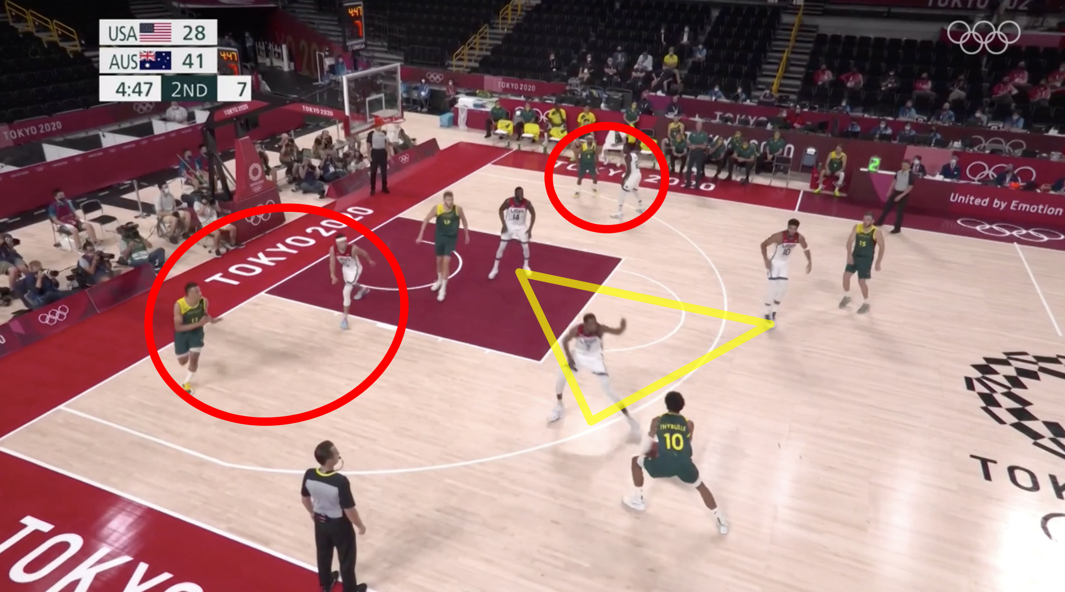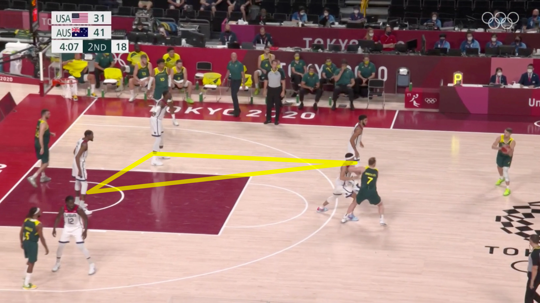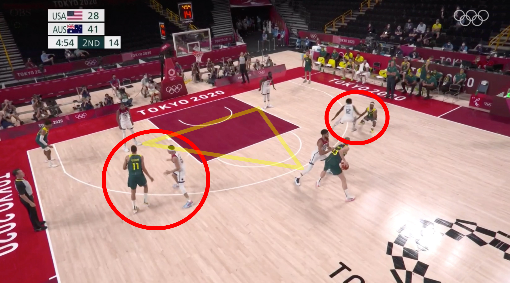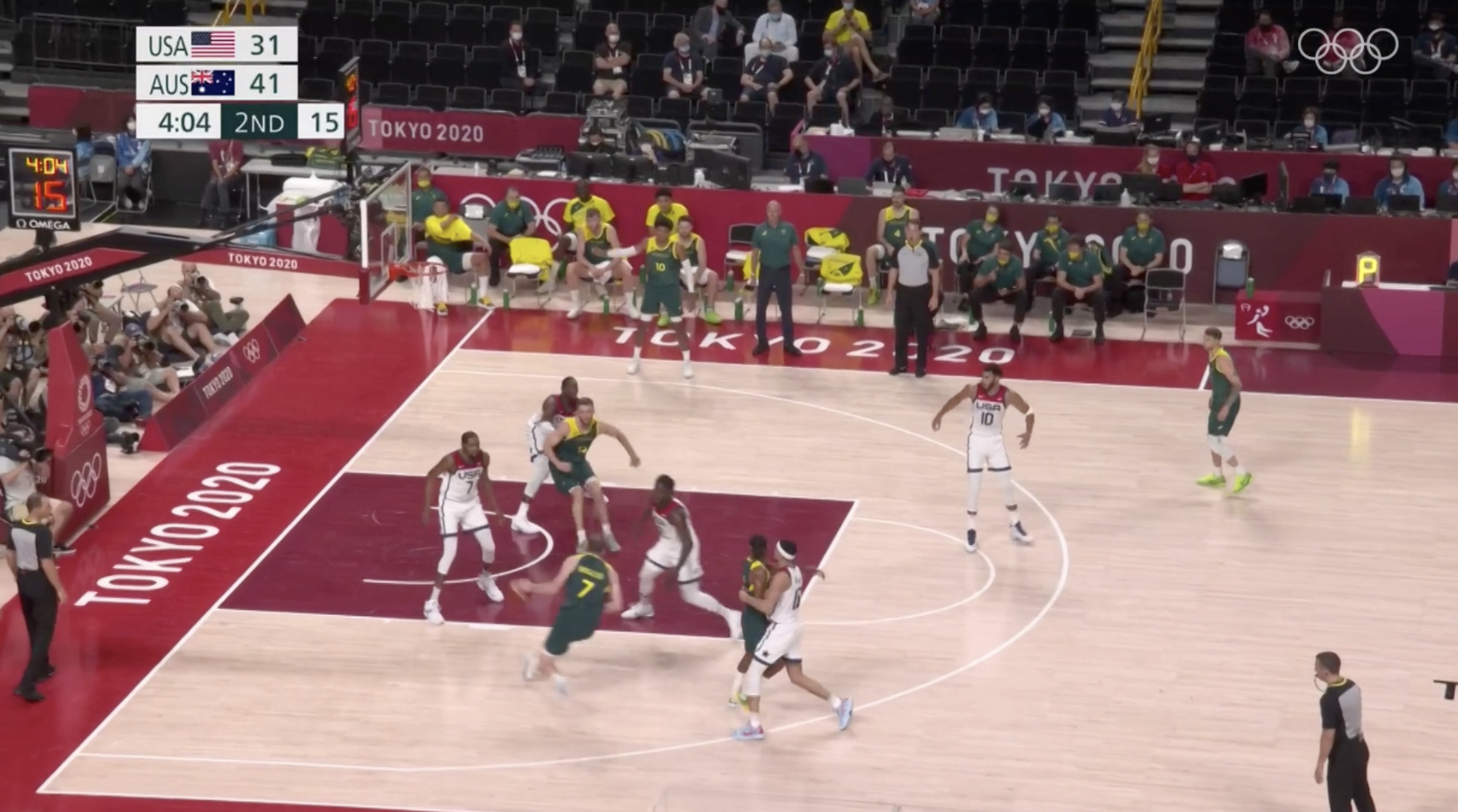Résultat : un cinglant 14-4 en cinq minutes qui a complètement retourné le sort de la rencontre. En détails, les Américains ont défendu 8 possessions en Triangle-and-2 en provoquant 4 pertes de balle et en limitant les Australiens à 1 sur 4 aux tirs. Coupés dans leur élan, les coéquipiers de Mills perdent finalement la rencontre 78-97.