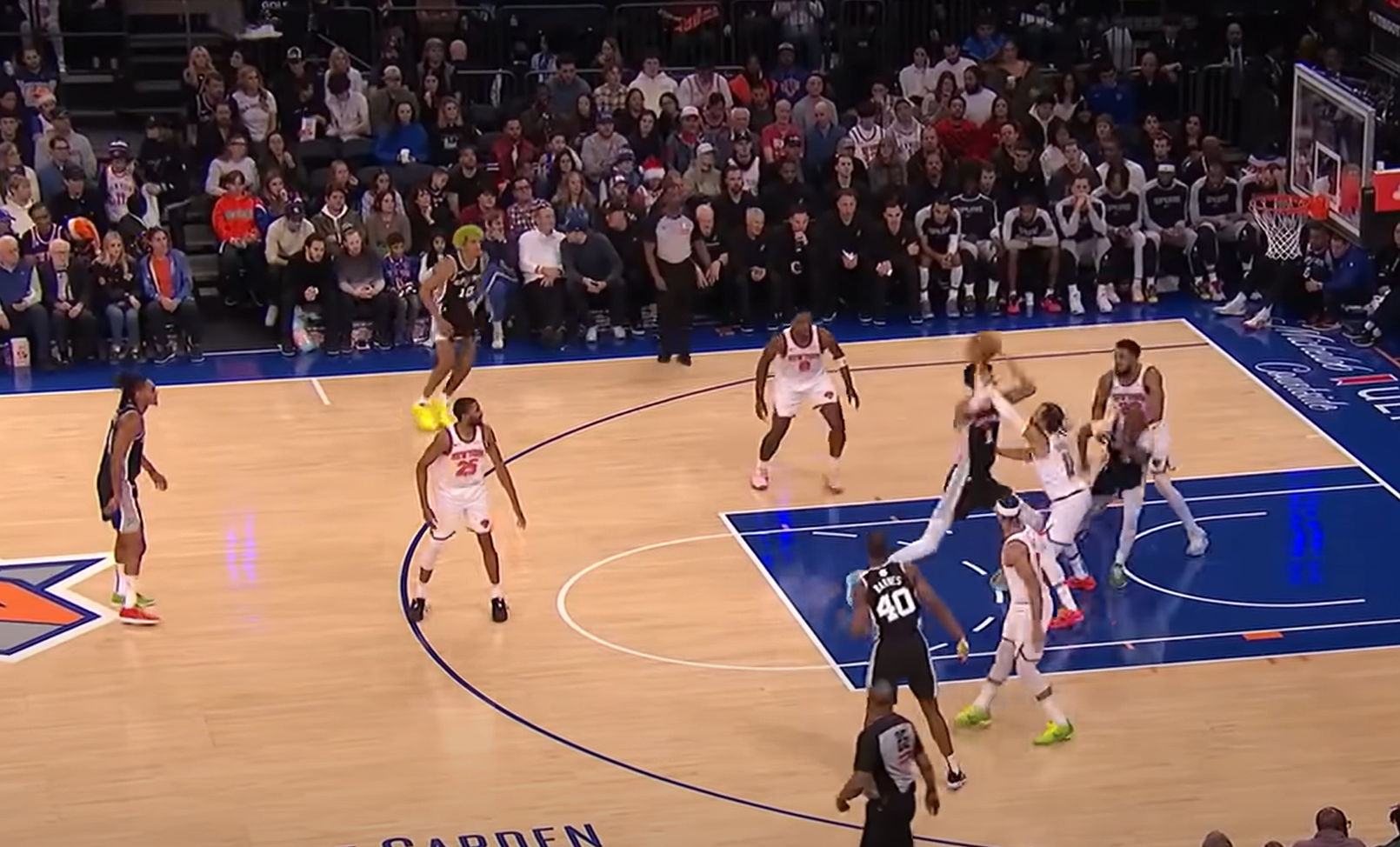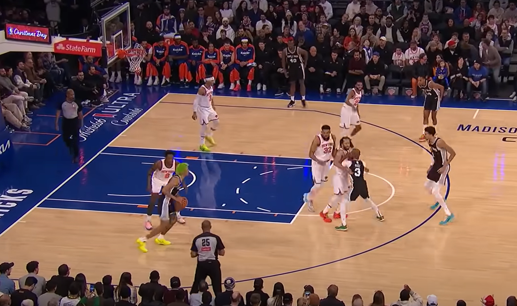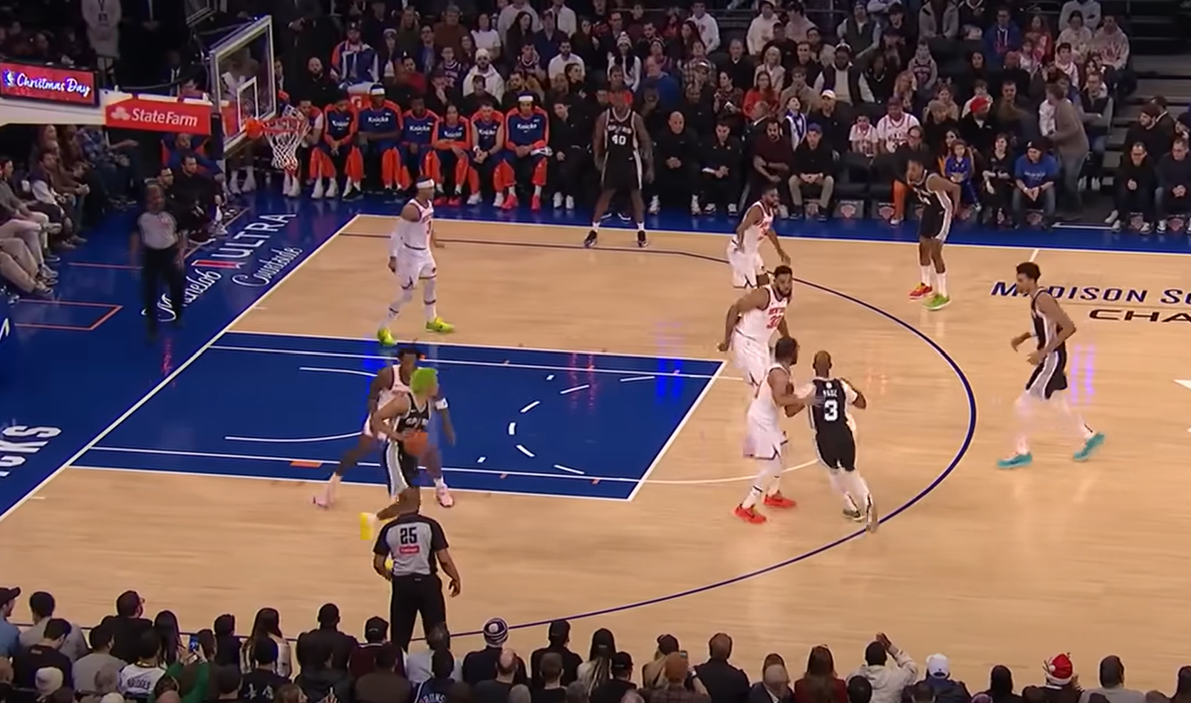 Les San Antonio Spurs ont un système simple pour démarquer leur superstar à proximité du panier. Exemple contre les New York Knicks lors du match de Noël. Tout part d’une isolation d’un joueur texan dos au panier d’un côté du terrain. Ici, Jeremy Sochan.