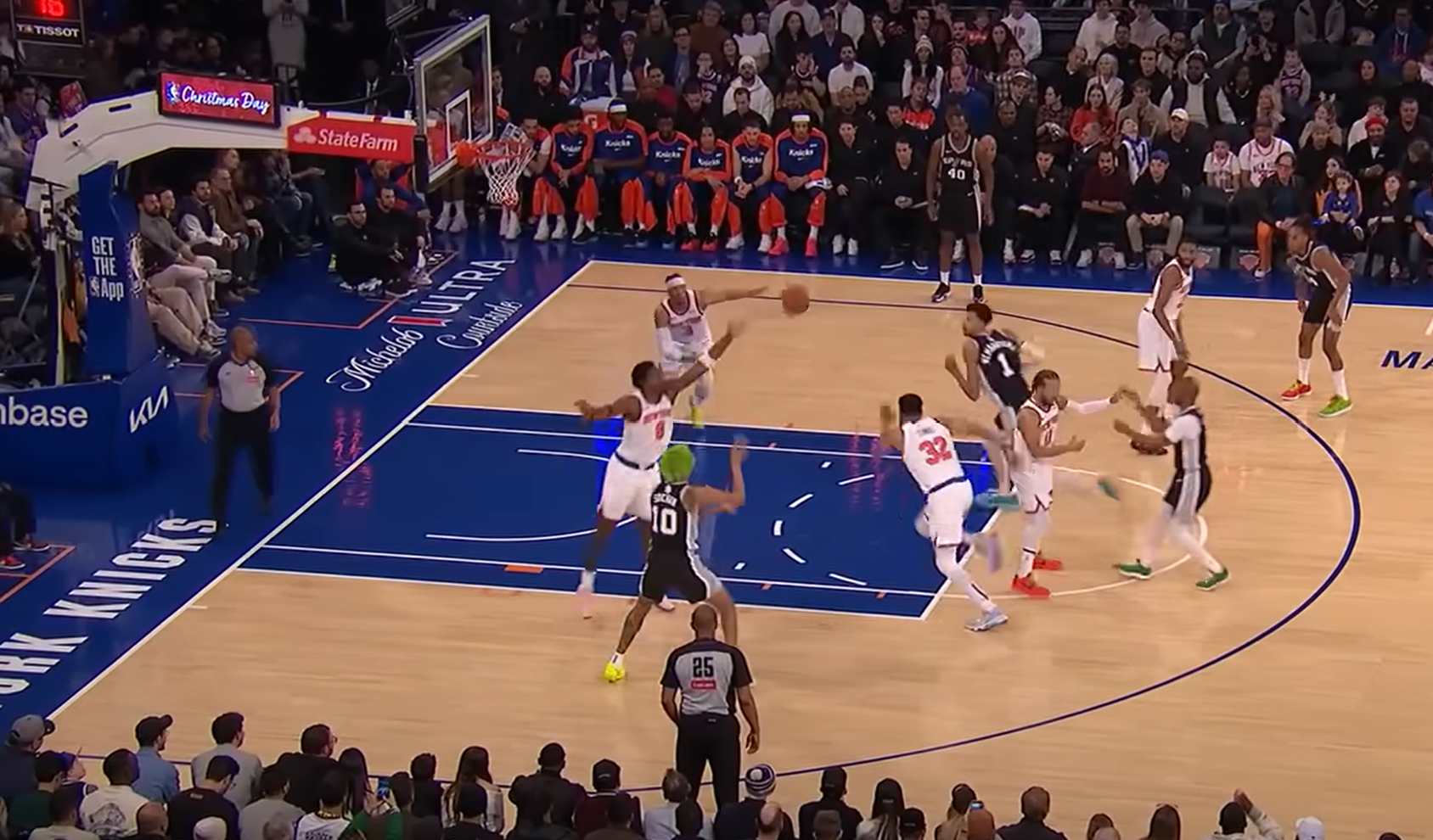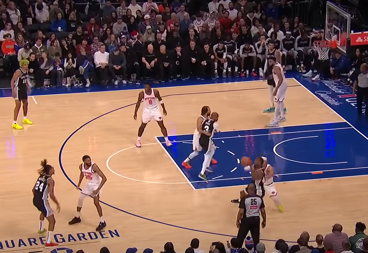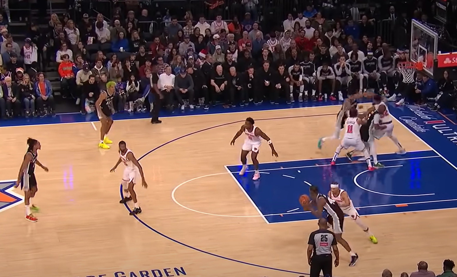 Les San Antonio Spurs ont un système simple pour démarquer leur superstar à proximité du panier. Exemple contre les New York Knicks lors du match de Noël. Tout part d’une isolation d’un joueur texan dos au panier d’un côté du terrain. Ici, Jeremy Sochan.