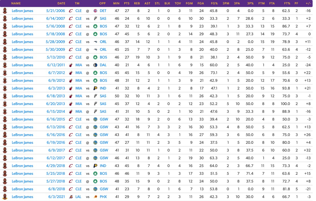 Il ne manque donc que le match 4 du sweep par les Nuggets l’année dernière. Un match que les Los Angeles Lakers n’ont perdu que de deux points grâce aux 40 pts, 10 rbds, 9 pds et 2 steals du King.