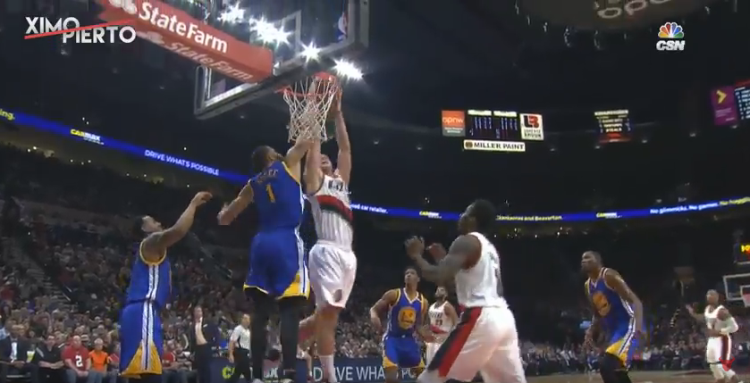 Mason Plumlee a plutôt bien défendu sur cette action mais il est toujours difficile pour un joueur de sa taille de ralentir Stephen Curry.