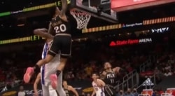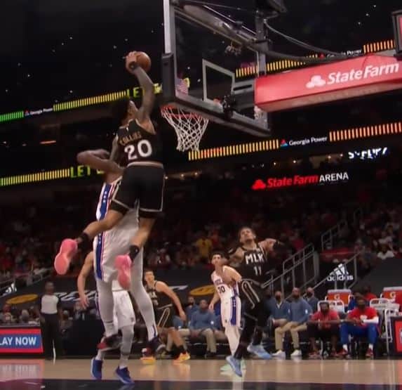 John Collins s'est pointé en conférence de presse avec un t-shirt où l'on pouvait voir une photo de son poster massif sur Joel Embiid.