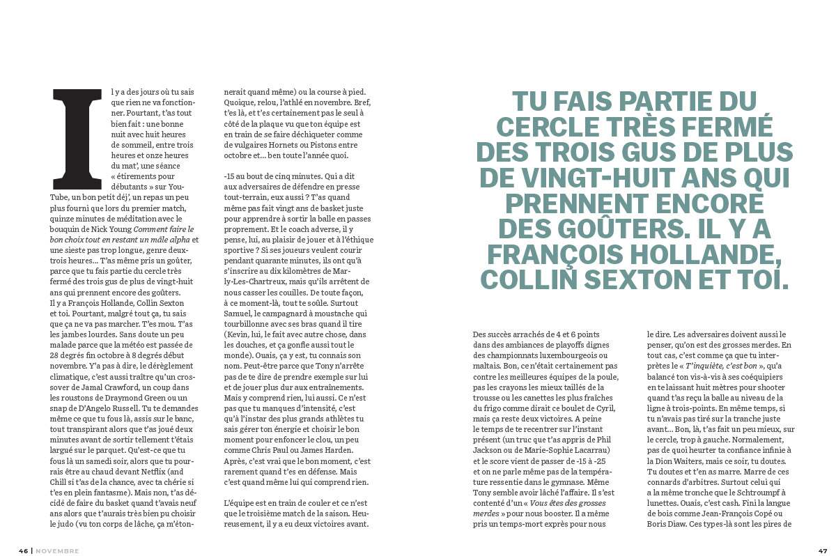 Cette année, c’est la bonne. Cette fois, c’est sûr ! Pour tout vous dire, ça devait déjà être le cas la saison dernière. Mais bon, pour ça, il aurait fallu que Xavier soit un tantinet moins fragile qu’Anthony Davis, que ces enfoirés d’arbitres comprennent un peu mieux le basket que Karl-Anthony Towns et que Kevin et Jordan arrêtent de s’inspirer de l’éthique de travail de Dwight Howard. Ah, c’est sûr que si on récompensait les conneries, on serait passé direct à l’échelon supérieur... Mais bref. Cette année, c’est la bonne. Fini de rire. Tout le monde est chaud. Tout le monde est déterminé. « On va aller la chercher, cette putain de montée ! » Ça, c’est ce qu’on s’est dit en juin autour d’un bon barbeuc avec l’équipe. Ce genre de moments sympathiques durant lesquels tu te rends quand même compte que la moitié de tes coéquipiers est composée de gros beaufs avec une descente d’alcool que tu ne remonterais pas à vélo, même avec les mollets et les ordonnances médicales de Wout Van Aert. Mais bon, c’était quand même cool comme repas, ça unit, ça regroupe, ça soude, surtout après la douzième bière. Après, pour dire vrai, il n’y avait pas vraiment toute l’équipe. On était cinq. Enfin, cinq en comptant Elodie, la copine de Kevin. Normal, ils organisaient ça chez eux.
